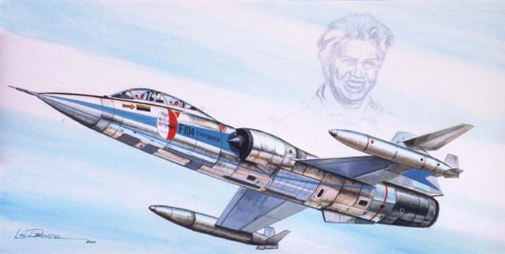 painting © Lou Drendel 1968 Jacqueline Cochran learned to fly in 1928 at the age of 22. She was the first woman to win the Bendix Transcontinental Race (1938) and established speed and altitude records for women. She was the director of the Women's Air Force Service Pilots (WASPS) during World War II, and became the first woman to fly a bomber across the Atlantic. She was awarded the Distinguished Service Medal in 1945, and was commissioned a Lieutenant Colonel in the Air Force Reserve. She became the first woman to break the sound barrier in this TF-104G Starfighter. |