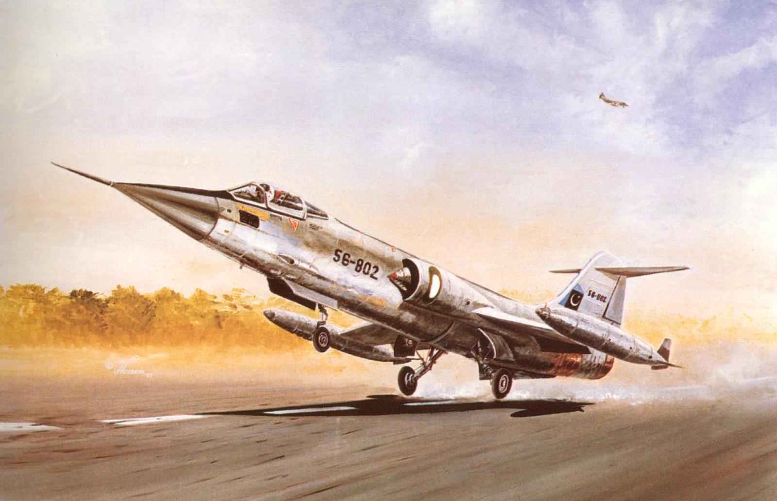 In 1962 the Pakistan Air Force (PAF) received its first Starfighter interceptor, a uniquely different design which could fly in excess of "Mach 2" (or twice the speed of sound) and reach altitudes in excess of 100,000 feet. This was the first Mach-2 fighter to go into squadron service and was, understandably the envy of all those flying less capable aircraft. In the PAF it was received with justifiable pride as it was a very demanding aeroplane to operate, and its very possession indicated the high esteem in which the PAF was held with regard to flying and engineering skills. The painting shows the first F-104 piloted by Squadron Leader Mian Sadruddin, landing at Sargodha runway. Following behind as No 2 is Flight Lieutenant M L Middlecoat. |