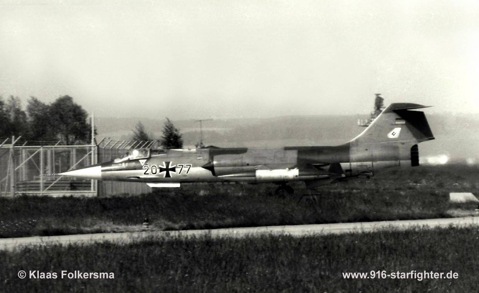 F-104G 20+77 JaboG 33 1974 F-104G, construction number 683-2090, company model 683-10-19, built by Lockheed manufactured by Group USA (ARGE-USA); flight test release May 7, 1962; assembly in Fighterbomber version according contract lot 7 flown with register number "190" for test flights; acceptance date by BABwLockheed on July 30, 1962 with 13:20 flight hours coded KF+165 airlifted to Germany August 11, 1962 in a Canadair CL-44D airfreighter of "Flying Tiger Line"; reassembled by Messerschmitt and factory test flight on September 7, 1962 project "Loreley" as Fighterbomber (for JaboG 33) with Vulcan M61 20 mm machine gun installed and long range tanks as loose parts; acceptance date May 7, 1963 by BABwMTT DC+241 JaboG 33 at Buchel AB delivery date on May 8, 1963; to Messerschmitt on March 23, 1966 for upgrading to a higher modification level camouflage scheme "Norm 62" according tech order "TA-196" in June 1966 DB+115 ErpSt 61 at Manching AB on May 1967 for arresting barrier system tests 20+77 JaboG 33 on July 24, 1969; Det. Decimomannu AB in 1975; crashed July 23, 1975 at Elmas, north of Cagliari, Sardinia due to engine failure after a compressor stall, pilot ejected but was badly injured; written off; struck off charge order (AVA) September 6, 1976. Project "Loreley": 42 Fighterbomber for the second wing designated to convert being JaboG 33 (FBW 33) at Buchel. copyright © Klaas Folkersma