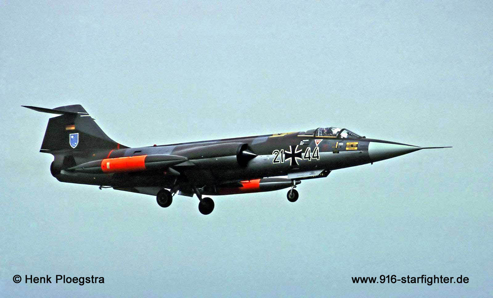 F-104G 21+44 WaSLw 10 on short final at Jever AB 1980 F-104G, construction number 683D-7012, company model 683-10-19, built by Messerschmitt manufactured by ARGE-Süd (South Group) with parts from Lockheed, assembly by Messerschmitt-Manching starting February 6, 1962 assembly in Fighterbomber version according contract lot 0; first flight June 13, 1962 coded KE+312 without test flight parked in long term storage at Messerschmitt according to project "21" for 1 year; test flight by Messerschmitt on October 23, 1963 camouflage scheme "Norm 62" according tech order "TA-196" at Messerschmitt on June 24, 1964; acceptance date July 9, 1964 by BABwMTT DD+257 JaboG 34 at Memmingen AB delivery date on August 21, 1964; recoded DD+237 in November 1964 21+44 WaSLw 10 at Jever AB on March 3, 1976; JaboG 32 at Lechfeld AB on December 10, 1982 withdrawn from use and stored at LwSchleuse 11 on July 20, 1983; struck off charge order (AVA) October 2, 1984MAP (Military Assistance Program) to Turkish Air Force October 16, 1984 with 2.692 flight hours (TuAF serial number 62-7012); coded “4-012” at 4.AJU at Murted AB coded “4-012” withdrawn from use on April 19, 1989 at Murted AB; scrapped according CFE July 13, 1995. Project "21": 21 aircraft from the ARGE-Süd production were provided with long-term conservation for the purpose of later rearmament and were parked at Manching. Later, when enough retrofit kits were available, the aircraft were upgraded. copyright © Henk Ploegstra