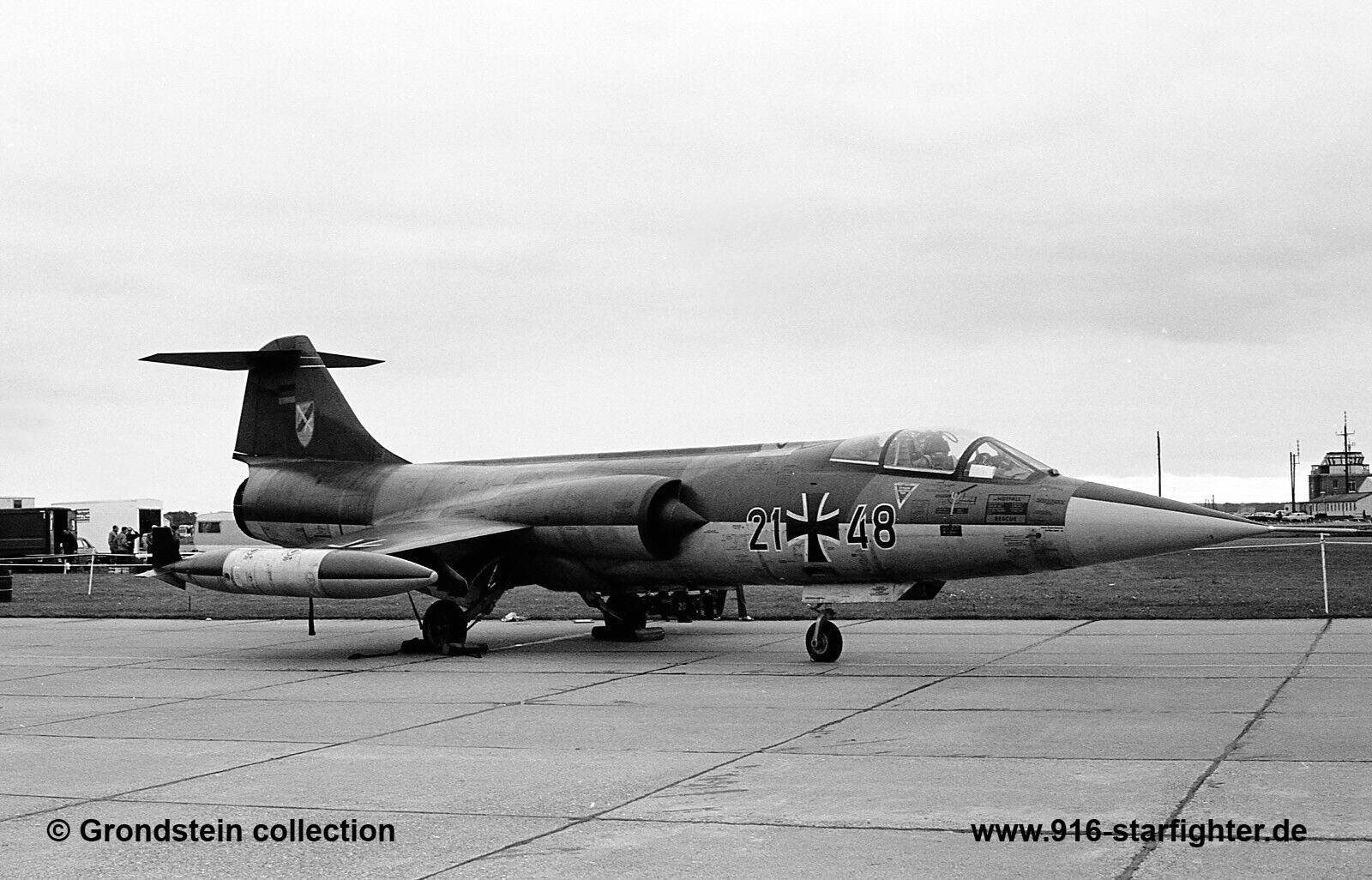 F-104G 21+48 JaboG 31 at Mildenhall AB, UK 1972 F-104G, construction number 683D-7016, company company model 683-10-19, built by Messerschmitt manufactured by South Group (ARGE-Süd); assembly by Messerschmitt-Manching starting March 12, 1962 with parts from Lockheed assembly in Fighterbomber version according contract lot 1; first flight August 29, 1962 coded KE+316 project "Replace" with modification as Fighterbomber (for JaboG 31) with Vulcan M61 20 mm machine gun installed and long range tanks as loose parts acceptance date April 30, 1963 by BABwMTT with 14:15 flight hours DA+107 JaboG 31 "Boelcke" at Norvenich AB delivery date on May 6, 1963; 4. TWM at Chaumont AB, France 11. till 25. June 1965; IRAN at SABCA on May 11, 1966 with 436 flight hours camouflage scheme "Norm 62" according tech order "TA-196", back to JaboG 31 on March 7, 1967 21+48 crashed on March 11, 1974 during landing at Norvenich AB after an engine failure due to compressor stall; pilot ejected safely written off; struck off charge order (AVA) May 21, 1974. Project "Replace": 21 aircrafts (partly with and partly without test flights) were stored with a long-term preservation for the purpose of a later upgrade and transfer to the BABwMTT for storage at Manching AB. 19 aircraft were later upgraded when enough retrofit kits were available. copyright © Grondstein collection