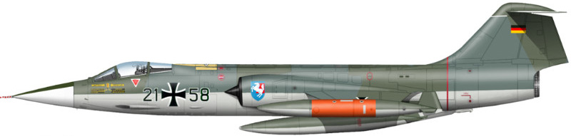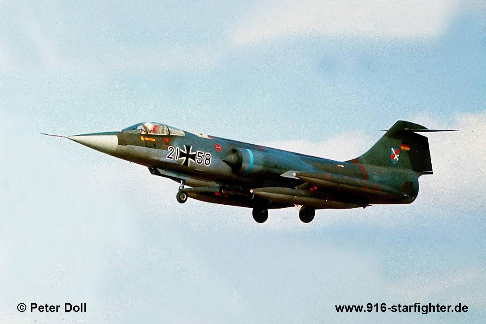 F-104G 21+58 JaboG 31 Norvenich AB 1968, temporary on loan from JaboG 36 F-104G, construction number 683D-7027, company model 683-10-19, built by Messerschmitt (MTT) manufactured by South Group (ARGE-Süd); assembly by Messerschmitt-Manching starting May 16, 1962 with parts from Lockheed; assembly in Fighterbomber version according contract lot 1 coded KE+327 delivery date August 12, 1962; without test flight preserved in long term storage according to project "21" camouflage scheme "Norm 62" according tech order "TA-196" in October 1964; first flight June 22, 1965 coded KE+327; acceptance date August 12, 1965 by BABwMTT DF+103 JaboG 36 at Hopsten AB delivery date on August 20, 1965 21+58 temporary on loan to JaboG 31 at Norvenich on February 16, 1968; Messerschmitt for IRAN on September 3, 1968, back to JaboG 36 on April 17, 1969 IRAN at SABCA on April 14, 1972, back to JaboG 36 on June 22, 1972; JaboG 31 on December 15, 1974; JaboG 33 at Buchel AB on April 26, 1983 stored at LwSchleuse 11 on September 29, 1983; JaboG 34 at Memmingen AB on March 21, 1984; LVR 1 "F-104 Kommando" at Erding AB on October 1, 1984 withdrawn from use at LwSchleuse 11 on April 29, 1986 with 3.208 flight hours; struck off charge order (AVA) November 2, 1985MAP (Military Assistance Program) to Turkish Air Force (TuAF serial number 63-7027) on July 1, 1986 crashed coded "4-027" with 141 Filo of 4.AJU on July 5, 1988 at or near Murted AB, pilot was ok; written off. Project "21": 21 aircraft from the ARGE-Süd production were provided with long-term conservation for the purpose of later rearmament and were parked at Manching. Later, when enough retrofit kits were available, the aircraft were upgraded. copyright © Peter Doll
