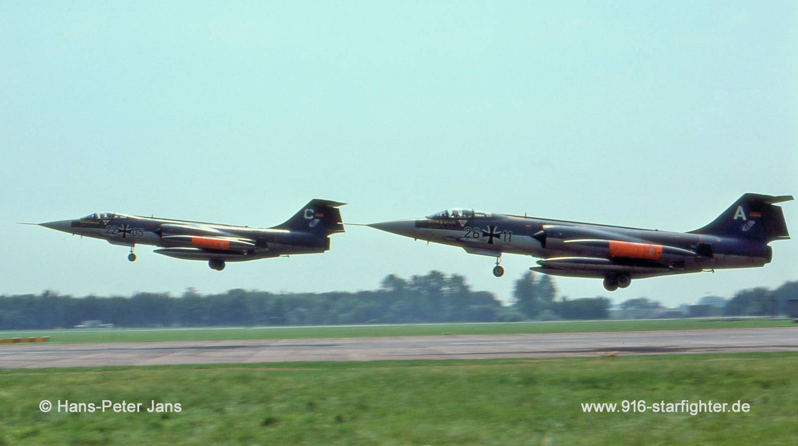 F-104G 22+05 "C" JaboG 33 at RAFG Wildenrath during Tactical Air Meet (TAM78) in June 1978 F-104G, construction number 683D-7075, company model 683-10-19, built by Messerschmitt (MTT) manufactured by South Group (ARGE-Süd); assembly by Messerschmitt-Manching starting January 9, 1963 assembly in Fighterbomber version according contract lot 3; first flight June 18, 1963 coded KE+375 project "Loreley" as Fighterbomber (for JaboG 33) with Vulcan M61 20 mm machine gun installed and long range tanks as loose parts acceptance date by BABwMTT on August 16, 1963 with 9:40 flight hours DC+256 JaboG 33 at Buchel AB delivery date on August 30, 1963 in Silver-finish colors heavily damaged on June 22, 1965 after landing in strong crosswind at Chaumont AB, France; aircraft skidded off the runway and pilot ejected safely July 30, 1965 repaired at Messerschmitt-Augsburg and at Manching; camouflage scheme "Norm 62" according tech order "TA-196" in 1966, back to JaboG 33 on October 20, 1966 22+05 code change start on November 13, 1967; IRAN at SABCA on September 17, 1969 with 848 flight hours, back to JaboG 33 on November 5, 1969 EL-70/EL-73 Electronic Counter Measure (ECM) system was installed in the weapon system in the late 70s with tech order "TA-FL1191" NATO exercise "Tactical Air Meet" at RAFG Wildenrath 5.till 14.June 1978 with code "C"; TLP Jever AB 29.August till 16.September 1983 crashed on August 10, 1984 near Beja AB, Portugal, pilot lost control during a dive recovery in ACM training and ejected safely at about 8.000 feet; written off struck off charge order (AVA) May 28, 1985. Project "Loreley": to equip 42 Fighterbomber for the second wing designated to be converted being JaboG 33 (FBW 33) at Buchel. copyright © Hans-Peter Jans