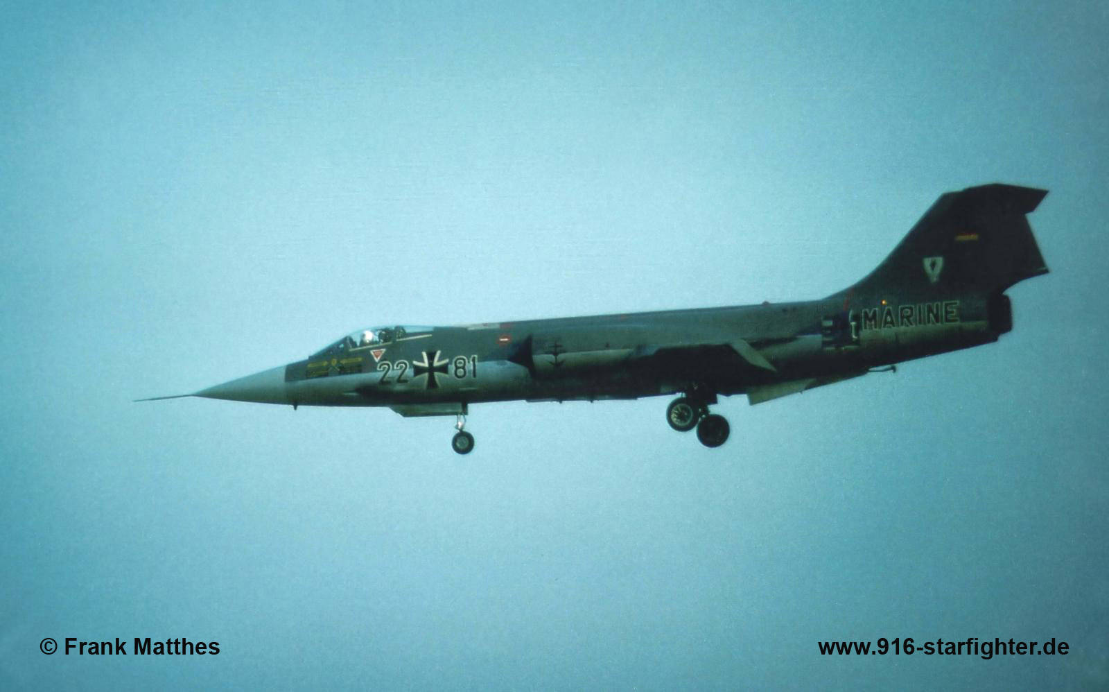 F-104G 22+81 Marinefliegergeschwader 1 (MFG 1) F-104G, construction number 683D-7163, company model 683-10-19, built by Messerschmitt (MTT) manufactured by South Group (ARGE-Süd); assembly start at Messerschmitt-Manching March 26, 1964 assembly in Fighterbomber version according contract lot 6; first flight June 5, 1964 coded KE+463 project "Yoga" as Fighterbomber (for MFG 1) with "AS.30" anti-ship missile delivery system, Sidewinder missile launch rails and long range tanks camouflage scheme "Norm 62" according tech order "TA-196"; acceptance date by BABwMTT September 3, 1964 VA+139 MFG 1 at Schleswig-Jagel AB delivery date on September 8, 1964 22+81 Navy camouflage scheme "Norm 76" according tech order "TA-196-3" in 1971; MFG 2 at Eggebek AB on April 2, 1980 withdrawn from use at LwSchleuse 11 on July 28, 1981; struck off charge order (AVA) October 13, 1981MAP (Military Assistance Program) to Hellenic Air Force (HAF) on October 7, 1981 with 2.089 flight hours stored at Athens without code; 1992 coded "FG-163" to 116th Pterix for 335th Mira at Araxos AB; coded "FG-7163" last flight 1992 withdrawn from use July 20, 1993 at KEA Hellinikon; disposal approval May 12, 1998; August 30, 2002 to KEA Hellinikon display at Tanagra AB February 25, 2003, dump Tanagra AB September 18, 2005 last noted preserved as "FG-7163" in the town Schimatari, near Tanagra AB; it arrived in 2006 or 2007; October 2009 last noted stored in a compound on the northern side of the Tanagra airfield, November 7, 2011 first noted; September 2024 noted. Project "Yoga": 22 F-104G Fighterbomber for the 2. Staffel (Squadron) of MFG 1 at Schleswig-Jagel with built-in "AS.30" anti-ship missile delivery wiring system, later the number was increased to 28. copyright © Frank Matthes