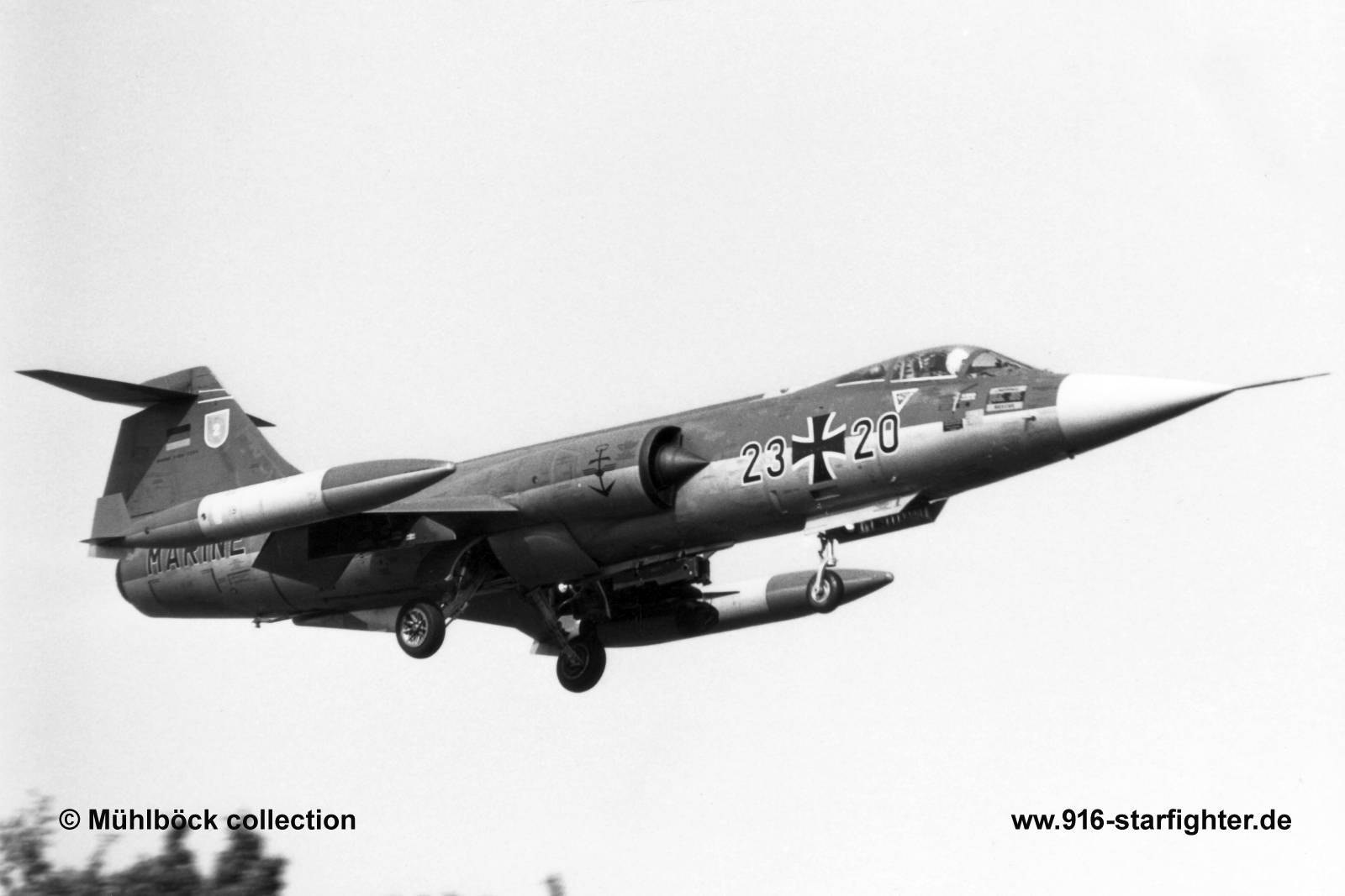 F-104G 23+20 MFG 2 in winter 1976 F-104G, construction number 683D-7204, company model 683-10-19, built by Messerschmitt (MTT) manufactured by South Group (ARGE-Süd); assembly by Messerschmitt-Manching starting December 10, 1964 assembly in Fighterbomber version according contract lot 8; first flight March 29, 1965 coded KE+504; acceptance date April 30, 1965 by BABwMTT modification level "Prince" as Fighterbomber (for MFG 2) with "AS.30" Kormoran anti-ship missile delivery system, Sidewinder missile launch rails and long range tanks camouflage scheme "Norm 62" according tech order "TA-196" VB+247 MFG 2 at Eggebek AB delivery date on May 10, 1965 23+20 Navy camouflage scheme "Norm 76" according tech order "TA-196-3" in 1971 crashed on November 9, 1979 near Haselund, Nordfriesland after pilot was unable to control the aircraft during a "Looping"; pilot ejected safely struck off charge order (AVA) May 7, 1980. Project "Prince": 25 Fighterbomber for the 2. Staffel (Squadron) of MFG 2 at Eggebek with built-in Vulcan M61 20 mm machine gun, AS.30 "Kormoran" anti-ship missile delivery wiring system, long-rane tanks and Sidewinder launchers as loose equipment. copyright © Mühlböck collection