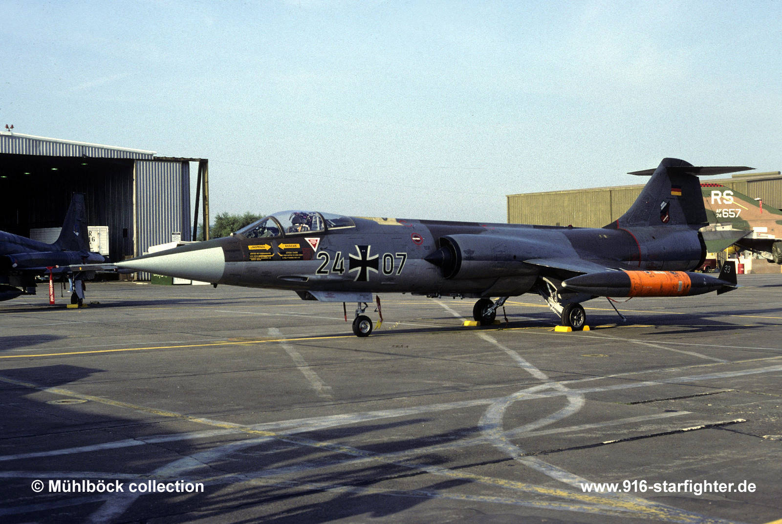 F-104G 24+07 JaboG 32 at Ramstein AB "Open House" in August 1979 RF-104G, construction number 683D-8146, company model 683-04-10, built by Fokker manufactured by North Group (ARGE-Nord); first flight August 29, 1963 coded KG+246 at Fokker-Schiphol to Fokker-Weserflug in August 1963 for RF-104G photoreconnaissance version modifications according project "Bacchus" (for AG 51) camouflage scheme "Norm 62" according tech order "TA-196"; acceptance date November 19, 1963 with 4:00 flight hours EA+235 AG 51 "Immelmann" at Ingolstadt-Manching AB delivery date on November 22, 1963; AG 51 relocated to Bremgarten AB in 1969 July 1966 AG 51 exchanged with the Marville Canadian Starfighters from both Squadrons (439 and 441 Squadron) A number of AG 51 aircraft (at least four) were seen in France wearing Canadian zaps (including the Canadian Flag on the tail covering the German ones) 24+07 JG 74 on November 24, 1970; modified to Fighterbomber version F-104G on December 16, 1970 at Messerschmitt-Bölkow-Blohm (MBB) JaboG 33 on May 11, 1971; Werft 11 at Erding AB on November 10, 1977 at attrition reserve aircraft operational with JaboG 32 at Lechfeld AB on August 21, 1978; withdrawn from use and stored at LwSchleuse 11 on August 3, 1982 with 3.280 flight hours struck off charge order (AVA) July 19, 1983MAP (Military Assistance Program) on August 4, 1983 delivered to the Turkish Air Force with TuAF serial 63-8146 as "Verteidigungshilfe" (Defense aid) flew coded "6-146" with 6.AJU at Bandirma AFB; crashed May 8, 1984 still operated by the 161 Filo of 6.AJU at or near Diyarbakir AB hitting the ground during a "Base attack" (CFIT) written off. Project "Bacchus": enclosed 42 RF-104G aircraft. They were modified before delivery either by Avio Diepen or by Weserflug. All RF-104G were intended for Reconnaissance Wing 51 (AG 51) at Ingolstadt/Manching. copyright © Mühlböck collection