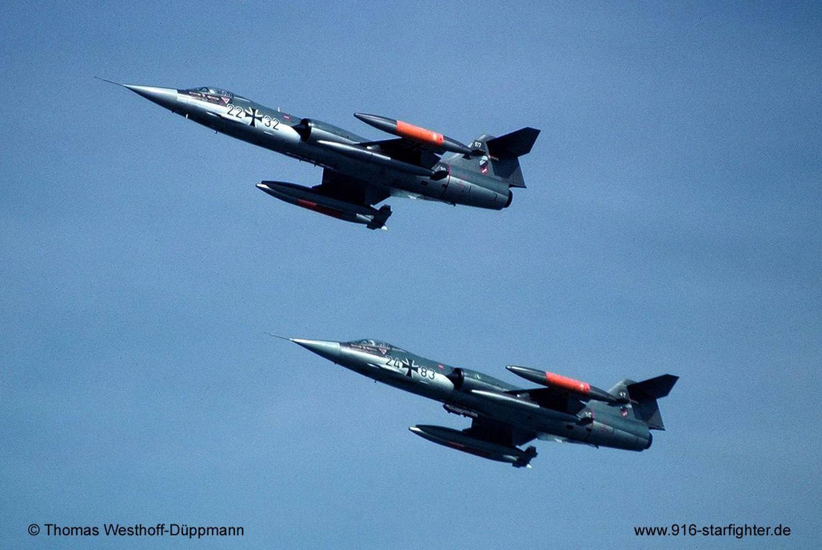 F-104G 24+83 JaboG 32 visiting RAF Gutersloh October 1981 RF-104G, construction number 683D-8233, company model 683-04-10, built by Fokker manufactured by North Group (ARGE-Nord); first flight March 16, 1964 coded KG+333 at Fokker-Schiphol RF-104G photoreconnaissance version modification at Weserflug in March 1964 with project "Recce" camouflage scheme "Norm 62" according tech order "TA-196"; acceptance date by BABwFokker (RNAF-MTA) June 17, 1964 with 4:45 flight hours LVR 3 (Luftwaffenversorgungsregiment 3) at Manching AB on July 6, 1964 for modifications EB+231 AG 52 at Leck AB delivery date on November 6, 1964; IRAN at SABCA on January 19, 1967 with 195 flight hours, back to AG 51 on March 14, 1967 24+83 JaboG 36 on June 2, 1971; modified to Fighterbomber version F-104G by Messerschmitt AG in July 1971; JaboG 32 on December 1, 1971 withdrawn from use and stored at LwSchleuse 11 on November 22, 1982 with 3.354 flight hours; struck off charge order (AVA) October 2, 1984MAP (Military Assistance Program) to Türk Hava Kuvvetleri (Turkish Air Force) with TuAF serial number 64-8233 on September 18, 1984; 4.AJU coded "4-233" 1984-1988 withdrawn from use and stored August 31, 1988; noted coded "4-233" in 1989 at Murted AB; CFE cut-up later; scrapped. Project "Recce": 66 RF-104G from ARGE-Nord, which were converted to RF-104G before delivery. They were mainly intended for the second squadron of WaSLw 10, AG 51, AG 52 and project Columbus. copyright © Thomas Westhoff-Düppmann
