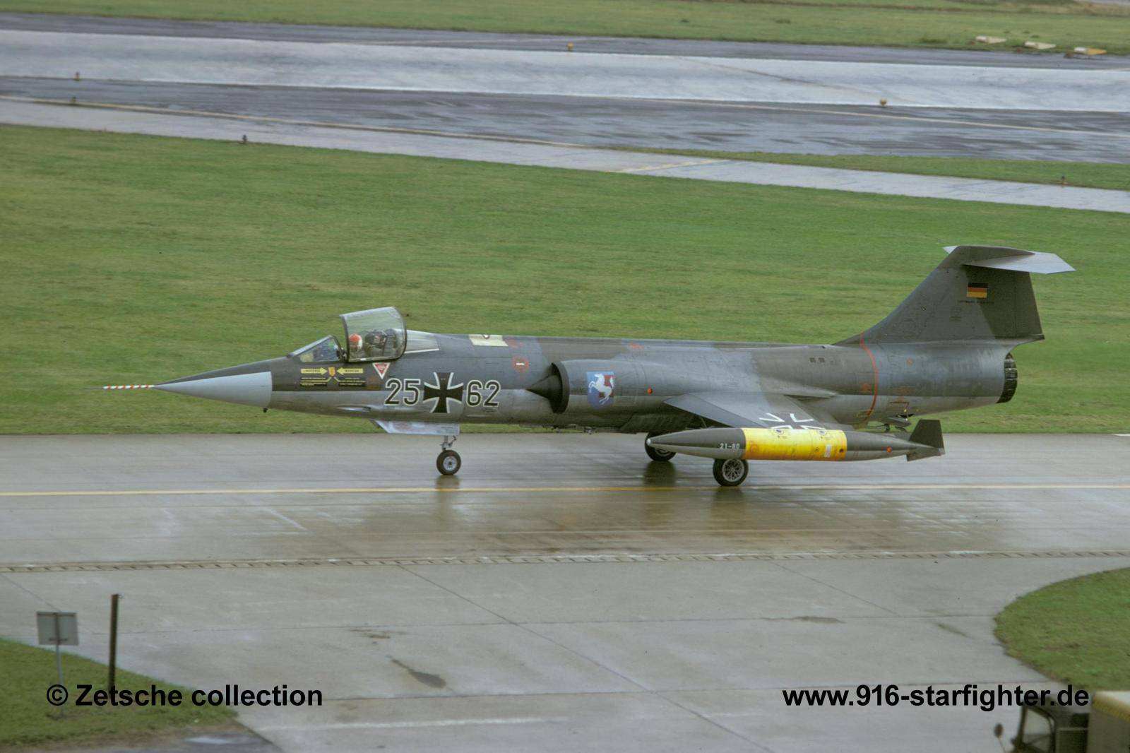 F-104G 25+62 JaboG 36 (FBW 36) at Hopsten AB during "Open House" September 29, 1973 F-104G, construction number 683D-9008, company model 683-10-19, built by SABCA the first fifteen aircraft (cn 9001-9015) were assembled from components originally supplied directly by Lockheed manufactured by West Group (ARGE-West); assembly start at SABCA-Gosselies, Belgium May 30, 1962 acceptance date by BABwSABCA September 12, 1962; first factory flight September 8, 1962 coded with construction number "9008" total of 3 factory test flights and 9 military test flights with 17 flight hours; factory test flights at Gosselies: 8.9.1962, 9.9.1962, 31.10.1962 military test flights at Gosselies: 11.9.1962, 13.9.1962, 7.11.1962, 7.11.1962, 15.11.1962, 5.12.1962, 7.12.1962, 7.12.1962 and 17.12.1962 (test) ready for delivery December 21, 1962; Luftwaffe delivery on January 21, 1963 coded KH+108 in AWX (All Weather Fighter) version under project "Green Hill" (for JG 71); code JA+244 was planed, but was not used; to LPR 1 on January 21, 1963 for upgrading to Messerschmitt for long-term storage on June 28, 1963; camouflage scheme "Norm 62" according tech order "TA-196" in November 1964 modified to Fighterbomber version December 14, 1964 at Messerschmitt DF+112 JaboG 36 at Hopsten AB delivery date on July 15, 1965 25+62 IRAN (periodic maintenance) at SABCA September 24, 1968 with 370 flight hours, back to JaboG 36 on November 15, 1968 IRAN (periodic maintenance) at SABCA December 15, 1971, back to JaboG 36 on March 6, 1972 JaboG 32 at Lechfeld AB on October 29, 1975; TechnGrp 11 of LVR 1 "F-104 Kommando" at Erding AB on April 12, 1984 crashed on July 10, 1984 after take-off from Eggebek AB NW of Stade after engine failure due to FOD (Foreign Object Damage); pilot ejected safely; written off; struck off charge order (AVA) February 6, 1985. Project "Green Hill": 42 AWX airplanes were delivered to the Fighter Wing 71 (Jagdgeschwader 71) at Wittmund. copyright © Zetsche collection