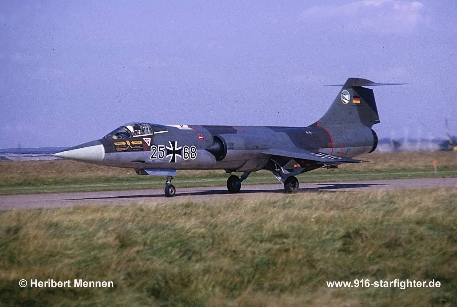 F-104G 25+68 JG 74 (FW 74) at RAF Binbrook, UK in September 1973 during a squadron exchange with 5 Squadron, flying the Lightning F.6 F-104G, construction number 683D-9014, company model 683-10-19, built by SABCA the first fifteen aircraft (cn 9001-9015) were assembled from components originally supplied directly by Lockheed manufactured by West Group (ARGE-West) in AWX (All Weather Fighter) version assembly start at SABCA, Belgium September 7, 1962 with parts manufactured by Lockheed first flight December 22, 1962 coded with construction number "9014"; 5 SABCA factory test flights and 6 military test flights with 14 flight hours military test flights at Gosselies: 27.2.1963, 4.3.1963, 6.3.1963,14.3.1963, 15.3.1963 and 27.3.1963 (test) coded KH+114 delivered in AWX (All Weather Fighter) version under project "Green Hill"; acceptance date April 9, 1963 by BABwSABCA in Silver-finish colors JA+250 JG 71 "Richthofen" at Wittmund AB delivery date on April 9, 1963; camouflage scheme "Norm 62" according tech order "TA-196" in 1964 damaged November 10, 1964 due to Engine fire during taxiing at Buchel; January 21, 1965 for repair to MTT and system upgrade, back to JG 71 July 27, 1965 25+68 JG 74 on February 26, 1973 October 1973 RAF 5 Squadron, based at Binbrook flying the Lightning F.6 exchanged with the German Air Force JG 74 (1st Staffel) based at Neuburg AB, seen at Binbrook was 25+68 withdrawn from use at LVR 1 (Luftwaffenversorgungsregiment 1) on November 7, 1974 with 1.519 flight hours struck off charge order (AVA) December 17, 1983; used for firefighting tests with WWDBw Munster instructional airframe (GIA) with MFlgLehrGrp Sylt coded "69+51" and tail of cn 7053 and fake construction number "1234" noted at Westerland July 29, 1987, restoration at Wernigerode preserved with skin removed to show internal for display purposes 2003 (fuselage only); owned by Mr. Clemens Aulich; May 2025 noted. Project "Green Hill": 42 AWX airplanes were delivered to the Fighter Wing 71 (Jagdgeschwader 71) at Wittmund. copyright © Heribert Mennen