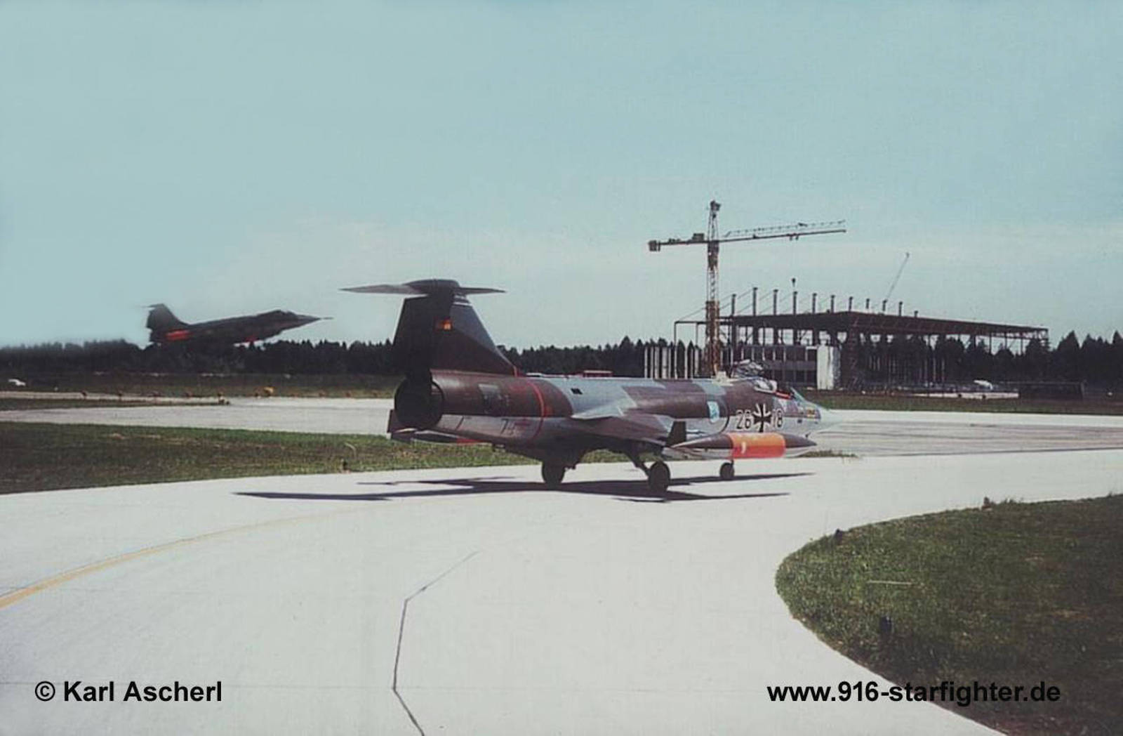 F-104G 26+18 JaboG 34 waiting for take-off at the end of the runway F-104G, construction number 683D-9163, company model 683-10-19, built by SABCA manufactured by West Group (ARGE-West); assembly start September 10, 1964 in Fighterbomber version; first flight January 7, 1965 coded with construction number "9163" 2 factory test fights and 3 military test flights with 6 flight hours; military test flights at Gosselies: 27.1.1965; 17.2.1965 and 24.2.1965 camouflage scheme "Norm 62" according tech order "TA-196"; coded KH+169 acceptance date February 24, 1965 by BABwSABCA DF+237 JaboG 36 at Hopsten AB delivery date on April 28, 1965; IRAN at SABCA on July 11, 1967 with 362 flight hours, back to JaboG 36 on March 25, 1968 26+18 IRAN at SABCA on September 3, 1971 with 952 flight hours, back to JaboG 36 on December 12, 1971 JaboG 34 at Memmingen AB on September 18, 1974; operated with flightdate and crash recorder LEADS 200 according tech order "TA-1411" crashed August 10, 1976 after a hard landing due to high sinkrate at Memmingen AB, tip tank touched the runway and the pilot took off again, due to a broken left main wheel he made a controlled ejection near Heimertingen, north of Memmingen AB; written off; struck off charge order (AVA) February 3, 1977. copyright © Karl Ascherl
