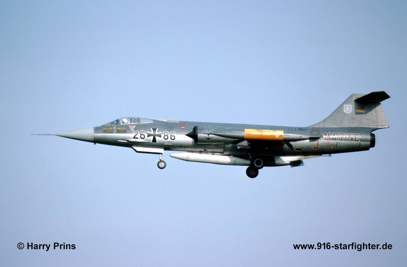 F-104G 26+86 Marinefliegergeschwader 2 (MFG 2) August 1975 F-104G, construction number 683D-7432, company model 683-10-19, built by MBB manufactured by South Group (ARGE-Süd) & VFW; assembled by MBB-Manching starting May 4, 1972; manufactured as attrition replacement aircraft assembly in Fighterbomber version according contract lot 10; first flight July 26, 1972 at MBB modification level "Neptun" as Fighterbomber (for German Navy) with AS.30 "Kormoran" anti-ship missile delivery system Navy camouflage scheme "Norm 76" according tech order "TA-196-3"; acceptance date October 6, 1972 by GPS-MBB with 6:10 flight hours 26+86 MFG 2 at Eggebek AB delivery date on October 11, 1972; withdrawn from use and stored at LwSchleuse 11 December 20, 1983; struck off charge order (AVA) January 30, 1985MAP (Military Assistance Program) to Turkish Air Force (TuAF serial 71-7432) on March 26, 1985 with 1.640 flight hours coded "6-432" with 161 Filo of 6.AJU at Bandirma AB September March 1985; coded as "6-432" of 161 Filo during Dragon Hammer exercise at Grazzanise AB 1989 noted 193 Filo of 9.AJU at Balikesir AB in 1990; as "8-432" with 181 Filo of 8.AJU at Diyarbakir AB in May 1993; withdrawn from use and stored Diyarbakir January 31, 1994 CFE cut-up later; scrapped "Neptun": 36 F-104G Fighterbomber for the German Navy with built-in AS.30 "Kormoran" anti-ship missile delivery wiring system. copyright © Harry Prins