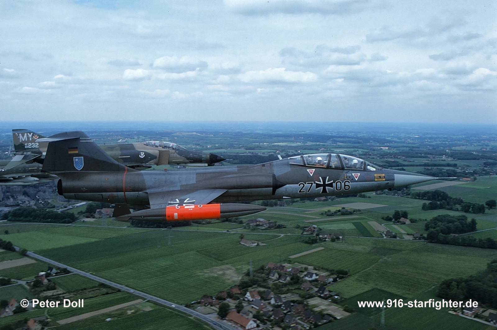 TF-104G 27+06 WaSLw 10 (OCU 10) from Jever during a Low Level mission over northern Germany 1977 TF-104G, construction number 583D-5707, company model 583-10-20, US serial number 61-3036, built by Lockheed manufactured by Lockheed (ARGE-USA); assembly at Lockheed-Palmdale; Lockheed test flights coded with US serial number 61-3036 at Palmdale, CA coded KE+207 to Germany acceptance date October 31, 1962 by BABwLockheed with 2:45 flight hours airlifted January 18, 1963 to Messerschmitt-Manching with a Canadair CL-44D airfreighter of "Flying Tiger Line" DA+036 code for Messerschmitt functional test flights on February 20, 1963 BB+106 WaSLw 10 (OTU 10) at Norvenich AB delivery date on April 8, 1963; February 9, 1964 the "II. Ausbildungsgruppe WaSLw.10" relocated from Norvenich to Jever AB camouflage scheme "Norm 62" according tech order "TA-196" in June 1965 27+06 JaboG 32 in May 1982; withdrawn from use at LwSchleuse 11 on February 22, 1983 with 2.769 flight hours; struck off charge order (AVA) March 4, 1983MAP (Military Assistance Program) to Turkish Air Force (Türk Hava Kuvvetleri) with TuAF serial number 62-5707 on April 13, 1983 coded "6-707" with 6.AJU at Bandirma AB in 1988; 1989 coded "9-707" with 193 Filo of 9.AJU at Balikesir AB withdrawn from use on January 10, 1991 and CFE treatment (cut-up); scrapped in the 90s. copyright © Peter Doll