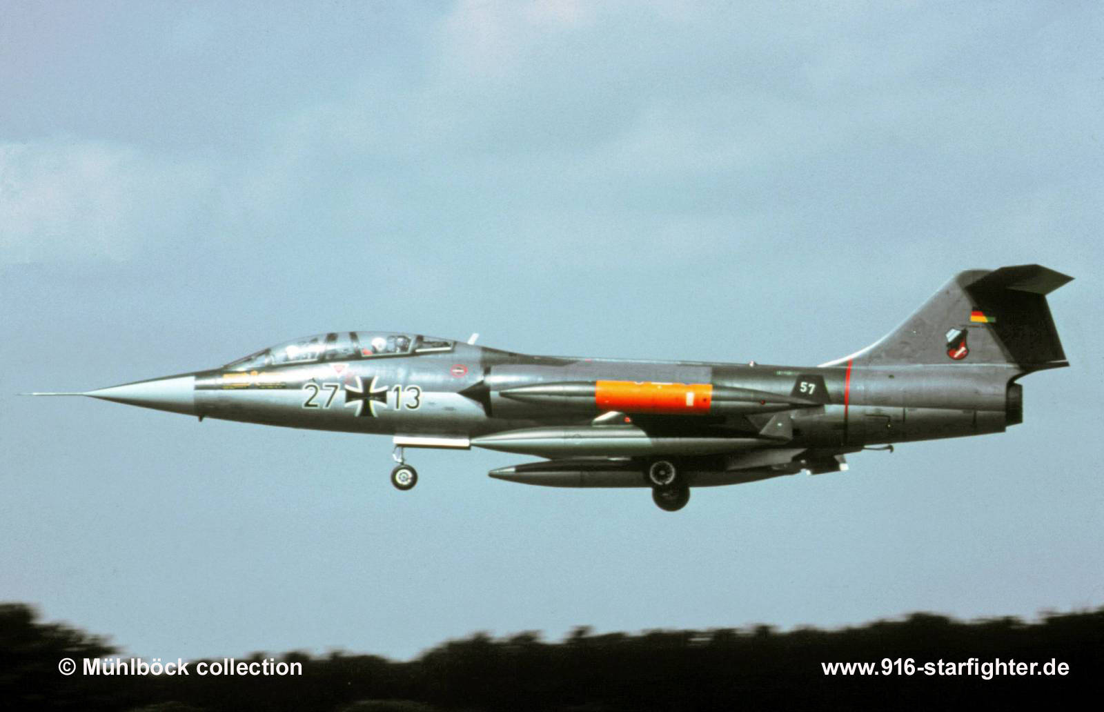 TF-104G 27+13 JaboG 32 at Twenthe AB, Netherlands 1976 TF-104G, construction number 5714, company model 583-10-20, US serial number 61-3043, built by Lockheed manufactured by Group USA (ARGE-USA); Lockheed test flights coded with US serial number 61-3043 KE+214 to Germany acceptance date January 9, 1963; damaged during loading on CL-44D airfreighter at Palmdale in February 1963 after repair stored at Mobile Air Materiel Area (MOAMA), Mobile, Alabama June 27, 1964 shipped to Bremerhaven coded DA+043 on August 22, 1964; reassembled at VFW and flown to Messerschmitt-Manching on September 11, 1964 modified and test flown October 30, 1964 at Messerschmitt; camouflage scheme "Norm 62" according tech order "TA-196" DB+372 JaboG 32 at Lechfeld AB delivery date on July 16, 1965 27+13 withdrawn from use at LwSchleuse 11 on September 29, 1984 with 2.611 flight hours; struck off charge order (AVA) October 4, 1984MAP (Military Assistance Program) to Hellenic Air Force on November 27, 1984 coded "TF-714" for 336 Mira of 116 Ptx destroyed on the ground by fire after the tip-tanks were jettisoned accidentally on July 16, 1985; written off (DBR) and withdrawn from use on March 14, 1989 at Hellinikon stored Hellinikon AB prior to the Athens Olympic Games; from Hellinikon to Agrinion July 2004; scrapyard of Agrinion July 2009 noted; fuselage only at dump Agrinion AB October 2017 noted. copyright © Mühlböck collection