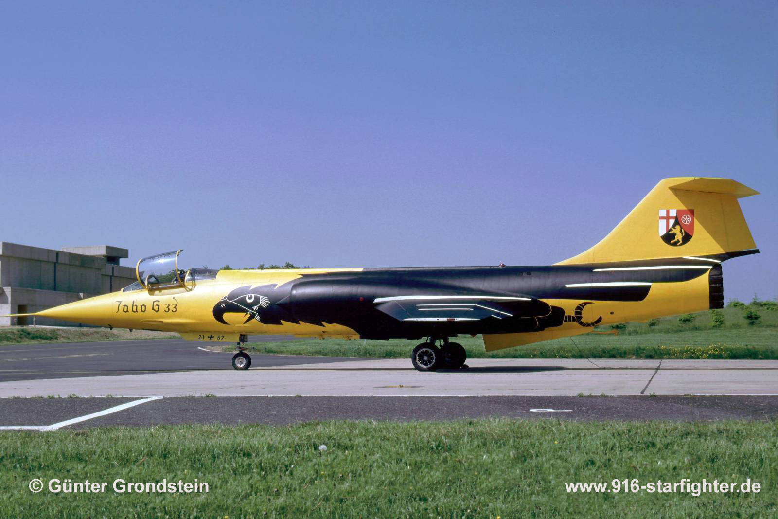 F-104G 21+67 "Geier" JaboG 33 Buchel AB 1985 F-104G, construction number 683D-7036, company model 683-10-19, built by Messerschmitt (MTT) manufactured by South Group (ARGE-Süd) with parts from Lockheed; assembly at Messerschmitt-Manching starting June 27, 1962 assembly in Fighterbomber version according lot 1; first flight March 7, 1963; acceptance date on May 22, 1963 by BABwMTT coded KE+336 with 10:35 flight hours project "Replace" with modification as Fighterbomber (for JaboG 31) with Vulcan M61 20 mm machine gun installed and long range tanks as loose parts DA+244 JaboG 33 at Buchel AB delivery date on May 22, 1963 in Silver-finish colors; JaboG 31 "Boelcke" at Norvenich AB on July 10, 1963 IRAN at SABCA on March 23, 1966 with 347 flight hours; system upgrading to higher modification level 2130 camouflage scheme "Norm 62" according tech order "TA-196" during PDM (Periodic Depot Maintenance) in 1966 DD+253 delivered to JaboG 34 at Memmingen AB on February 3, 1967 21+67 operated with flightdate and crash recorder LEADS 200 according tech order "TA-1411" EL-70/EL-73 Electronic Counter Measure (ECM) system was installed in the weapon system in the late 70s with tech order "TA-FL1191" stored at LwSchleuse 11 on November 14, 1984; JaboG 33 Buchel on April 29, 1985 JaboG 33 Buchel special marks for retirement ceremony F-104 "Geier" May 22, 1985 last flight with OTL Jürgen Stehli on May 30, 1985 with 3.486 flight hours; struck off charge order (AVA) April 23, 1985 instructional airframe (GIA) with apprentice shop JaboG 33 on April 23, 1985; on display Buchel AB coded "40+33" seen September 7, 1996 2000 Gate Guard Buchel coded "21+67" again; May 2025 noted. copyright © Günter Grondstein