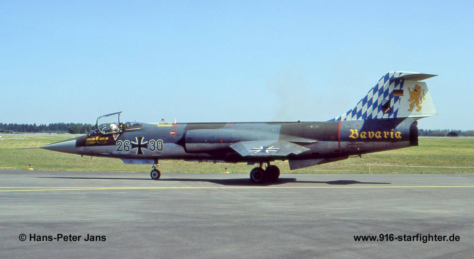 F-104G 26+30 spare aircraft for the 25th anniversary of JaboG 32 on July 26, 1983 F-104G, construction number 683D-9182, company model 683-10-19, built by SABCA manufactured by West Group (ARGE-West); assembly start at SABCA-Gosselies December 29, 1964 first flight April 29, 1965 coded with construction number "9182"; camouflage scheme "Norm 62" according tech order "TA-196" 2 SABCA factory test flights and 2 military test flights with 4 flight hours; military test flight at Gosselies: 25.5.1965 and 10.6.1965 KH+181 acceptance date June 10, 1965 in Fighterbomber version DF+249 JaboG 36 at Hopsten AB delivery date on August 4, 1965 26+30 IRAN at SABCA on July 2, 1968 with 556 flight hours, back to JaboG 36 on March 3,1969 heavily damaged on April 30, 1970, repaired by MBB on May 26, 1970, back to JaboG 36 on May 17, 1972 detached at Decimomannu from August 1, 1973 until December 14, 1973; JaboG 31 at Norvenich AB on December 14, 1973 JaboG 36 on January 2, 1974; JaboG 31 on January 6, 1975; JaboG 32 at Lechfeld AB on April 26, 1983 special markings as "Bavaria" (spare) for the 25th anniversary of JaboG 32 on July 26, 1983; stored at LwSchleuse 11 on December 8, 1983 new "Lizard" camouflage scheme "Norm 83" on February 16, 1984; JaboG 34 on September 19, 1984; on loan to TechnGrp 11 of LVR 1 "F-104 Kommando" on May 23, 1985 back to JaboG 34 on February 5, 1986; September 14, 1986 "Tag der offenen Tür" for "25 Jahre Fliegerhorst Hopsten" of JaboG 36 EL-70/EL-73 Electronic Counter Measure (ECM) system was installed in the weapon system in the late 70s with tech order "TA-FL1191" TechnGrp 11 of LVR 1 "F-104 Kommando" on February 5, 1988; withdrawn from use and stored at LwSchleuse 11 with 3.148 flight hours June 16, 1988 struck off charge order (AVA) February 21, 1989 and BRDT reserve airframe; BDRT training airframe at Norvenich AB July 28, 1992; dump Norvenich AB 1999 for sale by VEBEG in March 2004; sold to Piet Smedts and stored at Baarlo in BMW garage of Piet Smedts in May 2004 storage area of Piet Smedts at Kessel, district Limburg May 18, 2004; stored Kessels June 2009 noted; stored at Kessels April 2016 last noted September 8, 2016 to Maastricht Aviation Competence Center (ACC), a training organization for aircraft mechanics located at Maastricht-Airport for restoration November 2018 in grey colors coded "26+44" at Baarlo first noted; August 2020 last noted; November 1, 2022 noted on arrival at the "Pima Air and Space Museum" at Tucson, Arizona, USA; March 2025 noted. copyright © Hans-Peter Jansspecial marks as "Bavaria"