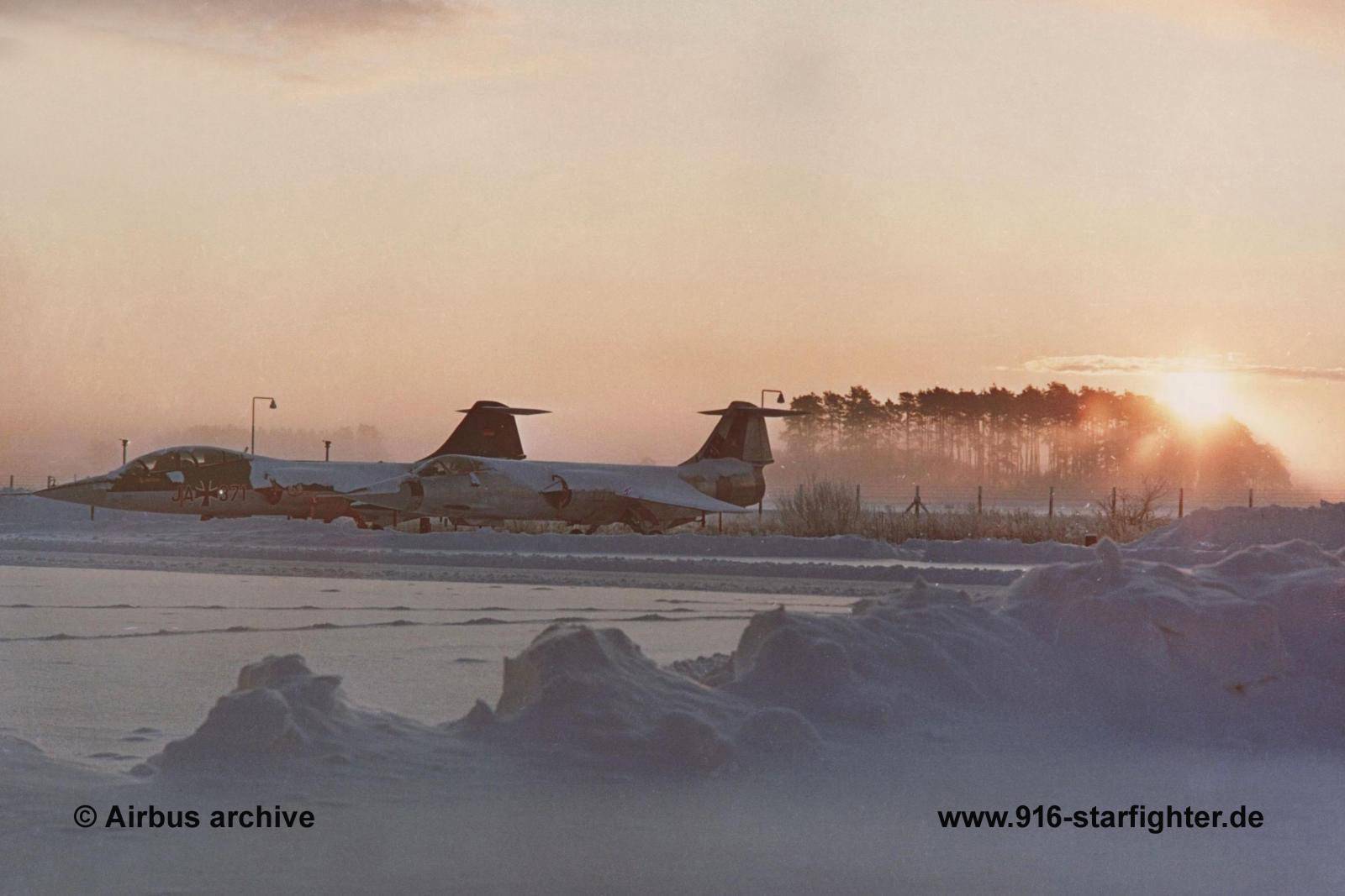 TF-104G JA+371 JG 71 "Richthofen" in winter of 1967 TF-104G, construction number 583D-5724, company model 583-10-20, US serial number 61-3053, built by Lockheed manufactured by Group USA (ARGE-USA); assembly at Lockheed-Palmdale; Lockheed test flights at Palmdale coded "61-3053" in 1963 acceptance date by BABwLockheed March 21, 1963 in Silver-finish colors; to Germany coded KE+224; airlifted to Manching on April 4, 1963 with a Canadair CL-44D airfreighter DA+053 code for assembly and test flights by Messerschmitt; camouflage scheme "Norm 62" according tech order "TA-196"; acceptance date October 31, 1963 by BABwMTT with 8:45 flight hours JA+371 JG 71 "Richthofen" at Wittmund AB delivery date on November 7, 1963; heavily damaged in 1967, repaired by Messerschmitt coded 27+23 back to JG 71 on March 7, 1968; WaSLw 10 (Weapons School 10) at Jever AB on January 2, 1974; JaboG 33 at Buchel AB on July 10, 1974 JaboG 32 at Lechfeld AB on July 3, 1975; JaboG 33 at Buchel AB on March 12, 1976; JaboG 34 at Memmingen AB on February 20, 1978; JaboG 33 on June 7, 1978 withdrawn from use and stored LwSchleuse 11 on March 30, 1984; struck off charge order (AVA) October 2, 1984MAP (Military Assistance Program) with 2.582 flight hours to Turkish Air Force (TuAF serial number 63-5724) November 15, 1984, no serial noted "4-724" crashed with 141 Filo on August 5, 1986 near Bolu, Turkey; one pilot was sadly killed in this accident, the 2nd pilot was safe; the cause of the accident is unknown; written off. note: during the take-off at Marville, FR on 24.01.1967 the rear canopy was lost (not properly locked, warning light overlooked), the fuselage and/or tail unit were also damaged. copyright © Airbus archive
