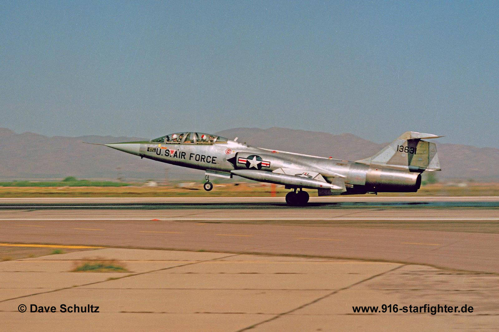 TF-104G "13631" (66-13631) 58th TFW Luke AFB, Arizona 1981 TF-104G, construction number 583F-5942, company model 583-10-20, US serial number 66-13631, assembly by Lockheed manufactured by Lockheed, Messerschmitt (ARGE-Süd) and VFW; main parts manufactured by ARGE-Süd (fuselage) and VFW (wings) parts (fuselage and wings) airlifted to Lockheed-Burbank on January 31, 1967 assembly and test flights at Palmdale coded with US serial number 66-13630 (planned code KF+242 was not used)operated in USAF Silver-finish colors by the 4510th CCTW at Luke AFB (German shadow serial number 2812, never used for registration) coded 13631 2.407 flight hours in May 1977; flown until end of operation at Luke AFB on March 16, 1983 struck off charge order (AVA) July 19, 1983; sold to USAF with 3.097 flight hours with "Phase III" lot