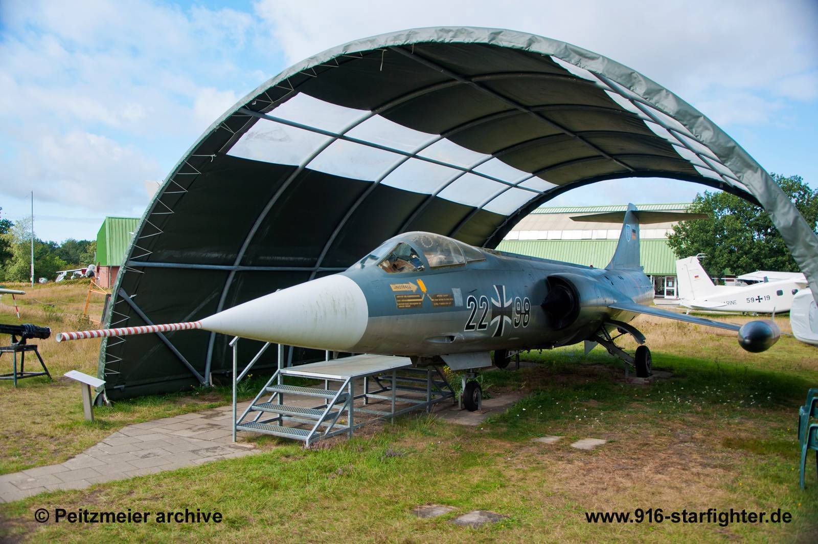 F-104G 22+98 MFG 2 at Marineflieger Museum "Aeronauticum", Nordholz AB 2020 F-104G, construction number 683D-7181, company model 683-10-19, built by Messerschmitt (MTT) manufactured by South Group (ARGE-Süd); assembly in Fighterbomber version according contract lot 7; assembly by Messerschmitt-Manching starting July 1, 1964 first flight October 1, 1964 coded KE+481; acceptance date by BABwMTT February 19, 1965 modification level "Yoga" as Fighterbomber (for MFG 1) with "AS.30" anti-ship missile delivery system, Sidewinder missile launch rails and long range tanks camouflage scheme "Norm 62" according tech order "TA-196" VA+153 ErpSt 61 at Manching AB delivery date on February 19, 1965; MFG 1 at Schleswig-Jagel AB on May 10, 1965 22+98 Navy camouflage scheme "Norm 76" according tech order "TA-196-3" in 1972; heavily damaged during landing after a collapsed nose wheel on June 27, 1974 at Decimomannu AB, Italy repaired at MBB and back to MFG 1 on July 15, 1976; MFG 2 on October 28, 1981 withdrawn from use and stored at LVR 1 (Luftwaffenversorgungsregiment 1) at Erding AB on August 16, 1984; struck off charge order (AVA) February 6, 1985 instructional airframe (GIA) at MFlgLehrGrp Sylt on March 12, 1985; stored Nordholz AB 1999 preserved "Aeronauticum" Marineflieger Museum, Nordholz AB with MFG 2 marks 2002 first noted; August 2019 under a cover noted; August 2024 noted. copyright © Peitzmeier archive53°46'29.06"N 8°38'23.17"E