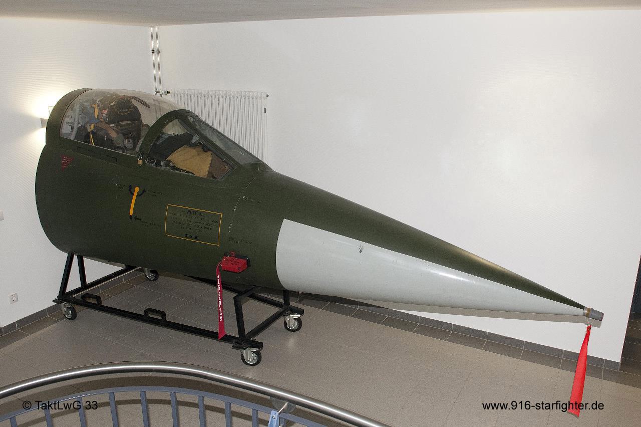 F-104G 24+11 cockpit display at HQ building of the TaktLwG 33 Buchel (former JaboG 33) in the "Brauheck" barracks at Cochem 2014 RF-104G, construction number 683D-8151, company model 683-04-10, built by Fokker manufactured by North Group (ARGE-Nord); first flight September 17, 1963 at Fokker-Schiphol coded KG+251 to Avio Diepen September 17, 1963 for RF-104G photoreconnaissance version modifications according project "Bacchus" (for AG 51) camouflage scheme "Norm 62" according tech order "TA-196"; acceptance date December 10, 1963 by BABwFokker (RNAF-MTA) with 3:35 flight hours EA+239 AG 51 "Immelmann" at Ingolstadt-Manching AB delivery date on February 4, 1964; AG 51 relocated to Bremgarten AB in 1969 24+11 AG 52 on September 25, 1970; at Messerschmitt modified to Fighterbomber version F-104G on June 16, 1971 JaboG 34 on October 27, 1971; ECM test modification at MBB on April 2, 1979 EL-70/EL-73 Electronic Counter Measure (ECM) system was installed in the weapon system in the late 70s with tech order "TA-FL1191" operated with flightdate and crash recorder LEADS 200 according tech order "TA-1411"; back to JaboG 34 on February 11, 1980 Lizard camouflage scheme "Norm 83" in 1984; TechnGrp 11 "F-104 Kommando" on August 19, 1987 withdrawn from use and stored at LwSchleuse 11 on October 30, 1987 with 3.729 flight hours; struck off charge order (AVA) January 13, 1989 BDRT training aid coded "C039" at Fassberg AB on June 19, 1989; last noted at Fassberg in 1995; scrapped August 2002 at Buchel AB aircraft was offered for sale via VEBEG and sold in July 2002, in pieces after cut-up by the GAF 2003 stored in pieces at Schwäbische Bauern und Technik Museum Seiferthofen on July 1, 2003 and last noted October 2005 (tail of 24+38 cn 8181) in March 2006 it was sold to Steve Alex and brought over to Weeze Apt and stored inside a QRA shelter on March 20, 2006 fuselage of 24+11 has been transported by truck from Weeze to Wernigerode on July 17, 2007 (only the fuselage of 24+11 is planned for the US and prepared for shipment to Bangor, Maine, US (Steve Alex) via sea transport fuselage, wings and tail stored outside, May 26, 2009 noted; tail at Weeze to be used for FX52 (August 7, 2007) currently the fuselage can still be found at Wernigerode; March 2014 last noted. Cockpit of 24+11 was saved at JaboG 33 Buchel after the cut-up and prepared as a mobile demonstration cockpit. On April 29, 2008 the cockpit was handed over to the Museum Flugsicherheit und Rettung e.V., Baden Airpark, Shelter, February 5, 2010 last noted World Of Flight-Museum für Flugsicherheit und Rettung March 2013 last noted, museum closed at the end of 2012 display at HQ building of the TaktLwG 33 Buchel (former JaboG 33) in the "Brauheck" barracks at Cochem-Brauheck (part of TaktLwG 33 Wehrgeschichtliche Sammlung) January 2014 noted April 2024 noted. Taktische Luftwaffengeschwader 33 (TaktLwG 33) Tactical Air Force Wing 33 renamed October 1, 2013 copyright © TaktLwG 3350° 7'59.53"N 7° 8'7.37"E - inside !