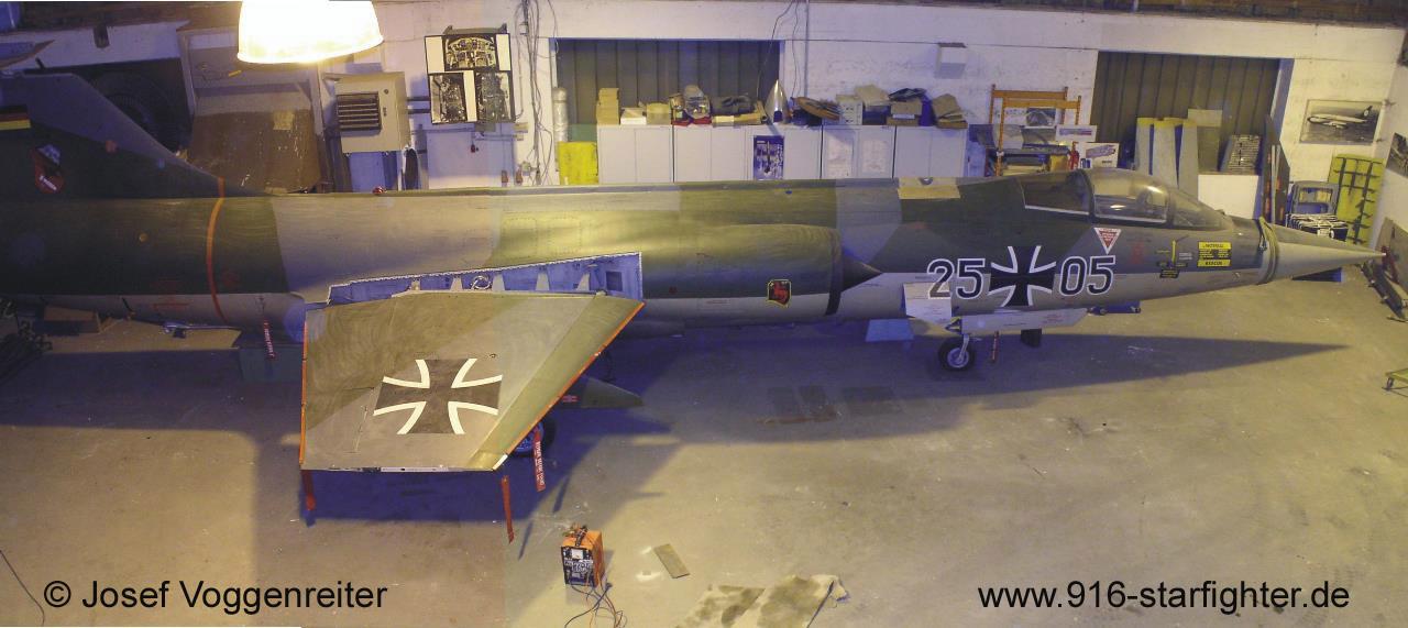 F-104G 25+05 at Niederalteich 2006 F-104G, construction number 683D-8263, company model 683-10-19, built by Fokker manufactured by North Group (ARGE-Nord); coded KG+363 first flight May 25, 1964 at Fokker-Schiphol camouflage scheme "Norm 62" according tech order "TA-196" acceptance date by BABwFokker in Fighterbomber version on July 3, 1964 with 3:40 flight hours LVR 3 (Luftwaffenversorgungsregiment 3) at Manching AB on September 23, 1964 for technical upgrading DB+106 JaboG 34 at Memmingen AB delivery date on December 10, 1964; JaboG 32 on January 28, 1966 IRAN at SABCA on March 16, 1967 with 213 flight hours, back to JaboG 32 on May 5, 1967 25+05 withdrawn from use and stored at LwSchleuse 11 on December 2, 1981 with 2.747 flying hours at Husum ABDR on August 19, 1982, struck off charge order (AVA) October 2, 1984 by road transport to Flugzeugunion Süd, Munich (FUS depot) Manching on July 8, 1993 private owned by Josef Voggenreiter at "Gerhard Neumann" Museum, Niederalteich, noted 1996 preserved at the Metal Engineering factory of Josef Voggenreiter in the town Niederalteich May 17, 2008 noted March 2024 noted. copyright © Josef Voggenreiter visit the greatest F-104 museum in the world: https://f-104.de/home