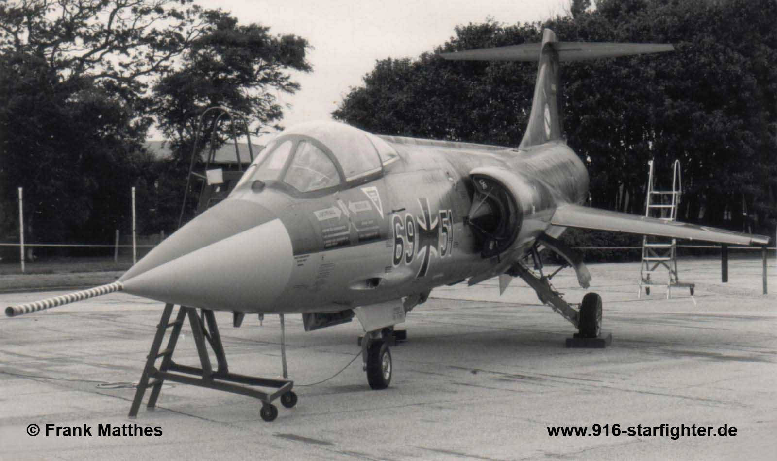 F-104G "69+51", ex 25+68 at MFlgLehrGrp Sylt 1987 F-104G, construction number 683D-9014, company model 683-10-19, built by SABCA manufactured by West Group (ARGE-West) in AWX (All Weather Fighter) version; assembly start at SABCA, Belgium September 7, 1962 with parts manufactured by Lockheed first flight December 22, 1962 coded with construction number "9014"; 5 SABCA factory test flights and 6 military test flights with 14 flight hours military test flights at Gosselies: 27.2.1963, 4.3.1963, 6.3.1963,14.3.1963, 15.3.1963 and 27.3.1963 (test) coded KH+114 delivered in AWX (All Weather Fighter) version under project "Green Hill"; acceptance date April 9, 1963 by BABwSABCA in Silver-finish colors JA+250 JG 71 "Richthofen" at Wittmund AB delivery date on April 9, 1963; camouflage scheme "Norm 62" according tech order "TA-196" in 1964 damaged November 10, 1964 due to Engine fire during taxiing at Buchel; January 21, 1965 for repair to MTT and system upgrade, back to JG 71 July 27, 1965 25+68 JG 74 at Neuburg AB on February 26, 1973; October 1973 RAF 5 Squadron, based at Binbrook flying the Lightning F.6 exchanged with the German Air Force JG74 (1st Staffel) based at Neuburg AB, seen at Binbrook was 25+68 withdrawn from use at LVR 1 (Luftwaffenversorgungsregiment 1) on November 7, 1974 with 1.519 flight hours struck off charge order (AVA) December 17, 1983; used for fire fighting tests with WWDBw Munster instructional airframe (GIA) with MFlgLehrGrp Sylt coded "69+51" and tail of cn 7053 and fake cn "1234"; noted at Westerland, July 29, 1987, restoration at Wernigerode preserved with skin removed to show internal for display purposes 2003 (center fuselage only); owned by Mr. Clemens Aulich; May 2025 noted. copyright © Frank Matthes