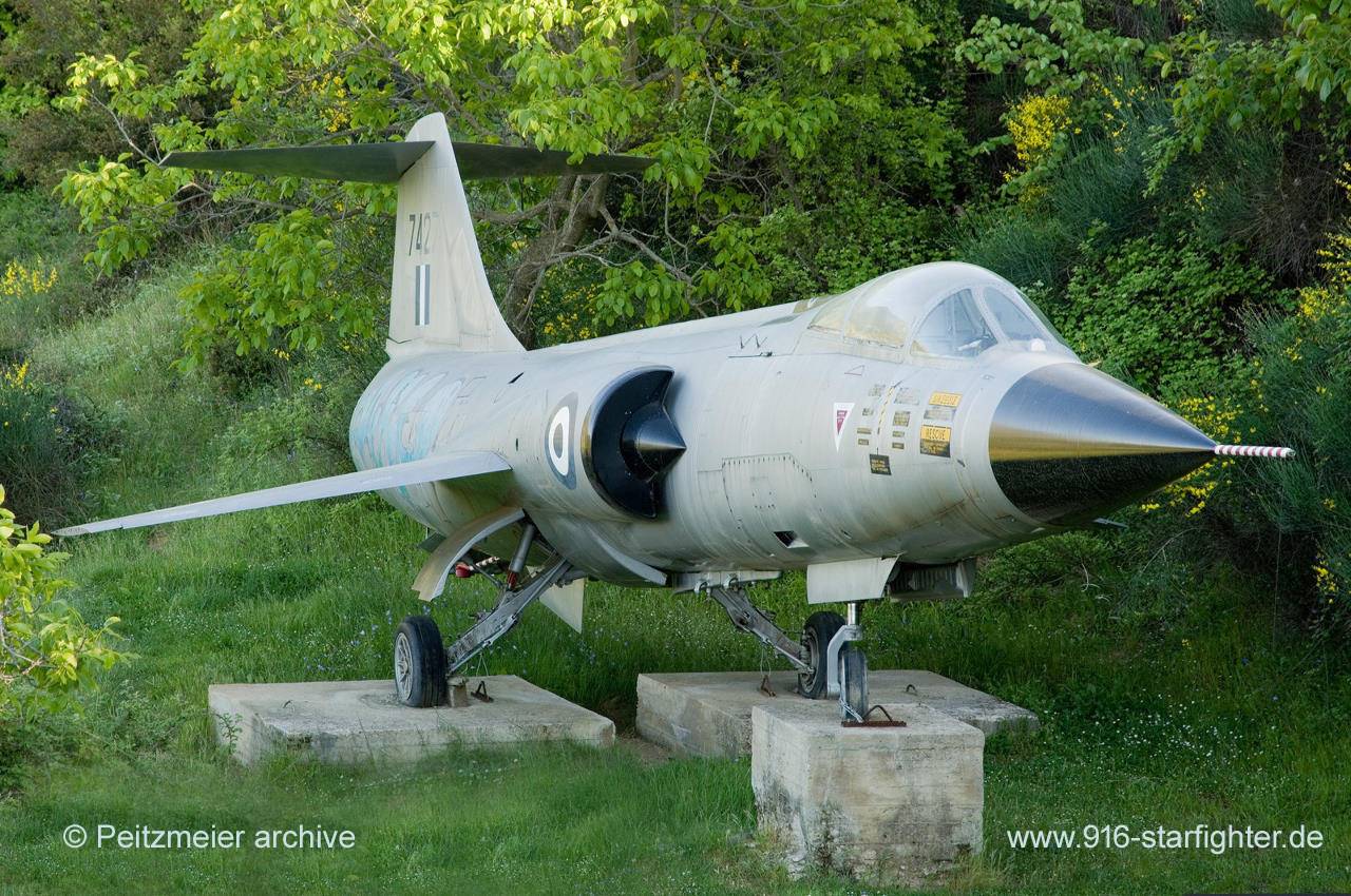 F-104G "FG-427" in a private property at Kapnochori, southwest of the Greek city Lamia 2017 F-104G, construction number 683D-7427, company model 683-10-19, built by MBB manufactured by South Group (ARGE-Süd) & VFW; assembled by MBB-Manching starting March 7, 1972 as attrition replacement aircraft assembly in Fighterbomber version according contract lot 9; first flight May 18, 1972 at MBB acceptance date by GPS-MBB June 21, 1972 with 3:15 flight hours modification level "Neptun" as Fighterbomber (for German Navy) with AS.30 "Kormoran" anti ship missile delivery system Navy camouflage scheme "Norm 76" according tech order "TA-196-3" 26+81 MFG 2 at Eggebek AB delivery date on July 3, 1972 January 30, 1984 to Luftwaffenschleuse 11 for AN/ALE-40(N) Chaff/Flare countermeasure dispenser equipment according tech order "TA-1469", back to MFG 2 on March 5, 1984; TechnGrp 11 "F-104 Kommando" at Erding AB on October 31, 1986 withdrawn from use and stored at LwSchleuse 11 on March 24, 1987; struck off charge order (AVA) September 1, 1988MAP (Military Assistance Program) to Hellenic Air Force (HAF) October 25, 1988 with 2.404 flight hours operated by the 116 Pterix (Wing) at Araxos AB coded "FG-427" last flight from 116 Combat Wing to 132 Combat Group at Agrinion (HAF Detachment) on April 7, 1993; withdrawn from use on July 20, 1993 March 22, 2004 it was transported to KEA Hellinikon for maintenance preserved above the small village of Kapnochori in a private property south-west of the Greek city Lamia May 2005 first noted code "FG-427"; May 2025 noted. copyright © Peitzmeier archive