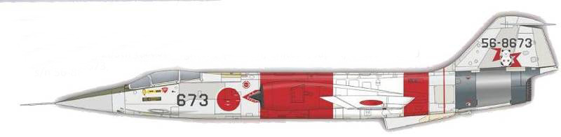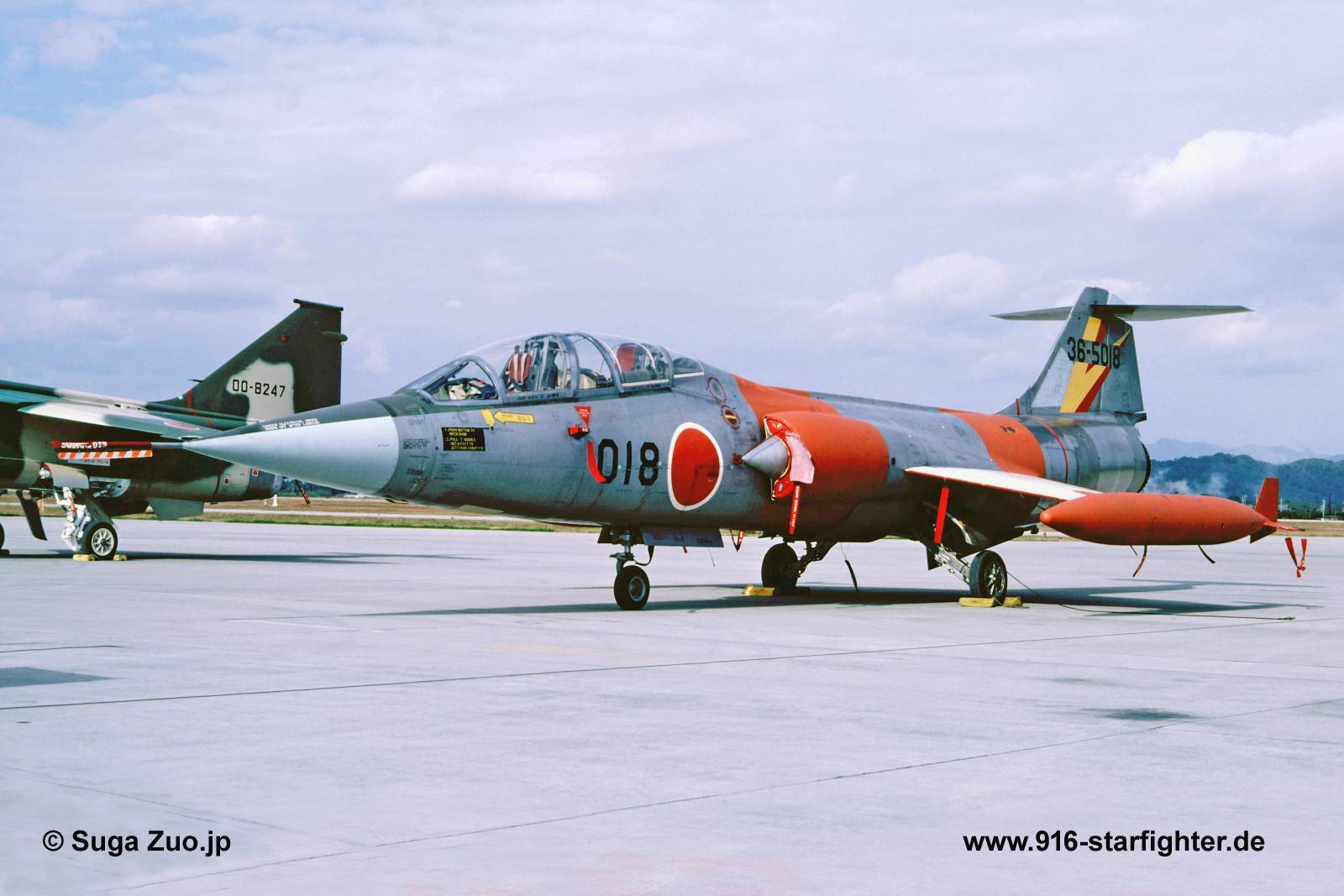 F-104DJ "018" (36-5018) 202 squadron JASDF in special ACM meeting colors (red bands around fuselage) in November 1980 F-104DJ, construction number 583B-5418, Model 583-10-17, JASDF serial number 36-5018, Lockheed builtreassembled from supplied knock-down kits by Lockheed; delivery date October 11, 1963 first Hikotai unknown; later 207 Hikotai; from 1972 with 202 Hikotai; from about 1977 205 Hikotai; later 204 and 202 Hikotai 202 sqn ACM colors carrying red bands around the fuselage November 1980; withdrawn from use 1981; scrapped. copyright © Suga Zuo