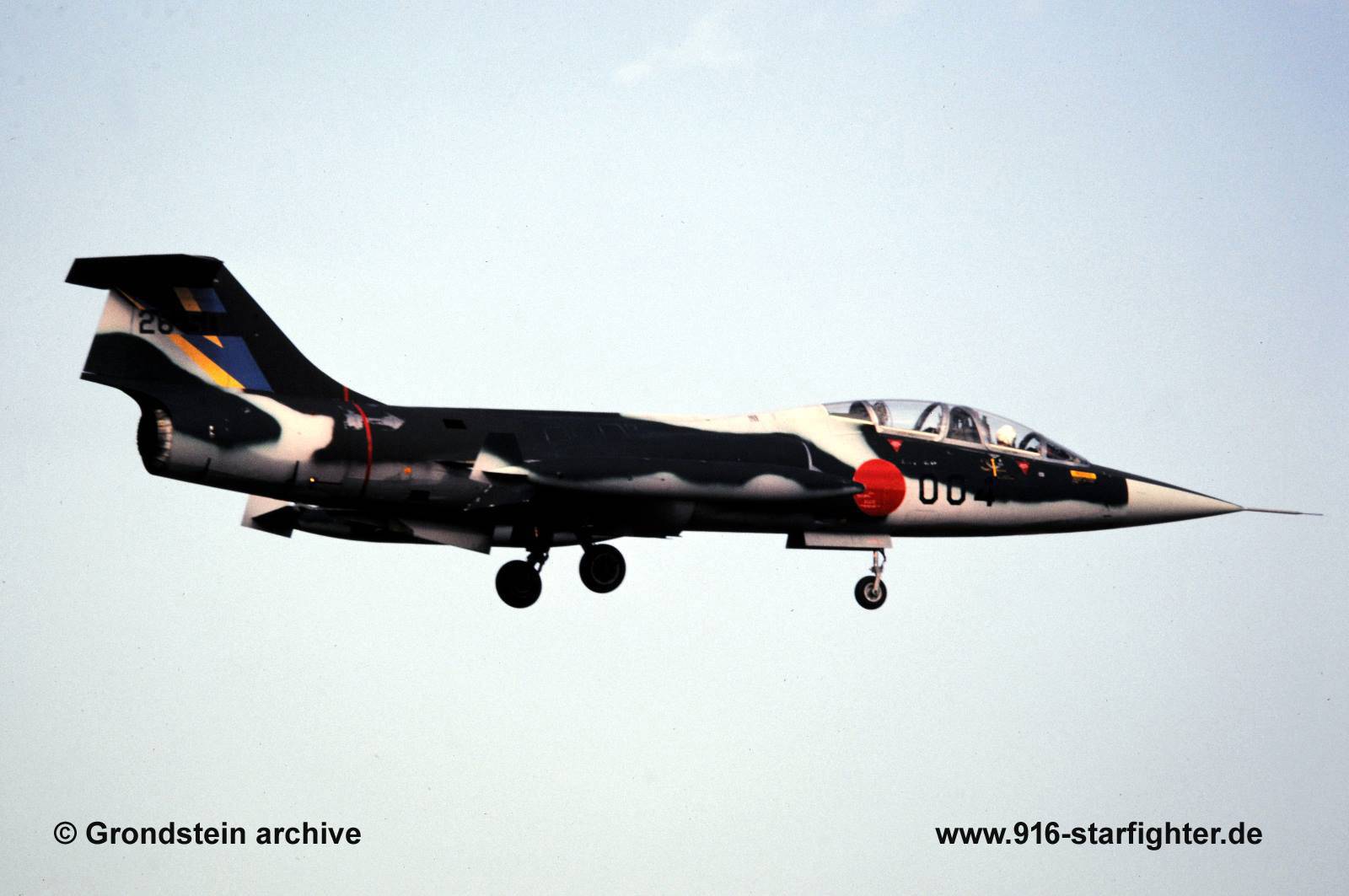 F-104DJ "004" 204 squadron Japanese Air Self Defense Forces (JASDF) carrying a "Khaki-light grey" camouflage scheme during ACM meeting in 1983 F-104DJ, construction number 583B-5404, model 583-10-17, serial number 26-5004, Lockheed built, reassembled by MitsubishiLockheed built, reassembled by Mitsubishi; delivered to the Japanese Air Self Defense Forces (JASDF) on August 8, 1962; first operational with 201 Hikotai of 2 Kokudan in 1970 it switched to 204 Hikotai of 5 Wing; September 9, 1984 at the Misawa AB air show (Aomori Prefecture) "004" wore front canopy numbered 26-5004, and rear canopy numbered 26-5010 with 204 Hikotai seen in November 1984 at Komatsu AB; to 207 Hikotai of 83rd Air Group in 1985; March 4, 1985 to APW at Gifu Air Base and used for training test pilots at Gifu to 207 Hikotai of 83 Air Group in December 1985; put in storage at Gifu Air Base in 1986; withdrawn from use April 18, 1986