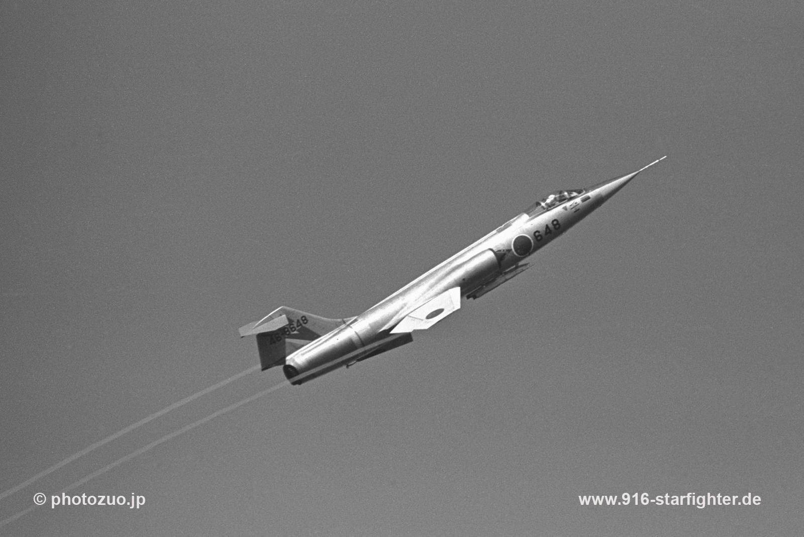 F-104J "648" 204 Hikotai (squadron) at Nyutabaru AB during an Open Day demonstration 1979 F-104J, construction number 683B-3148, model 683-07-14, JASDF serial number 46-8648, built by MitsubishiMitsubishi-built; delivery date December 8, 1964; to 201 squadron of 2 Wing; later 203 squadron of 2 Wing; 1978 to 204 squadron of 5 Wing ACM exercise October 1979 with orange band over the central fuselage; 1982 withdrawn from use. copyright © Suga Zuo