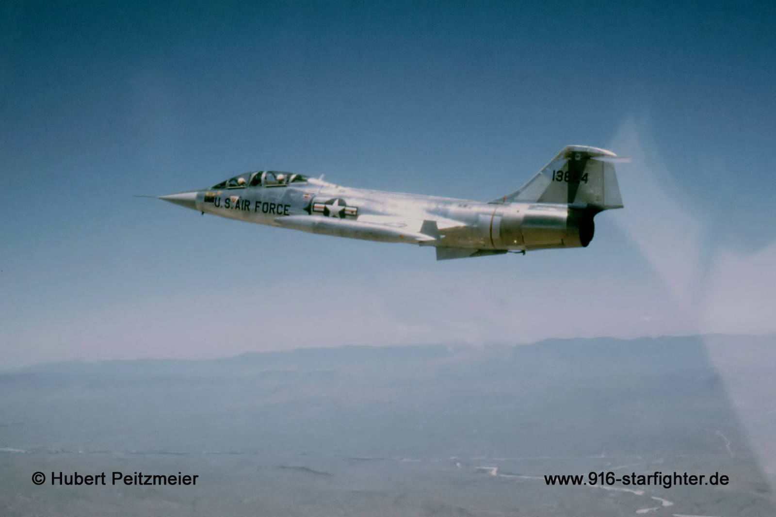 TF-104G "13624" (66-13624) climbing into the training area 1968 TF-104G, construction number 583F-5935, model 583-10-20, US serial number 66-13624, assembly by Lockheed manufactured by Lockheed, Messerschmitt (ARGE-Süd) and VFW; main parts manufactured by ARGE-Süd (fuselage) and VFW (wings) airlifted to Lockheed-Burbank on November 16, 1966; assembly and test flights coded "13624" at Palmdale (planned code KF+235 was not used)operated in USAF Silver-finish colors by the 4510th CCTW at Luke AFB (German shadow serial number 2805) coded 13624 crashed February 6, 1976 on Gila Bend Bombing Range after loss of right forward flap and subsequent loss of control; both pilots ejected safely, operated by 418 TFTS; 2.039 flight hours; written off. copyright © Hubert Peitzmeier