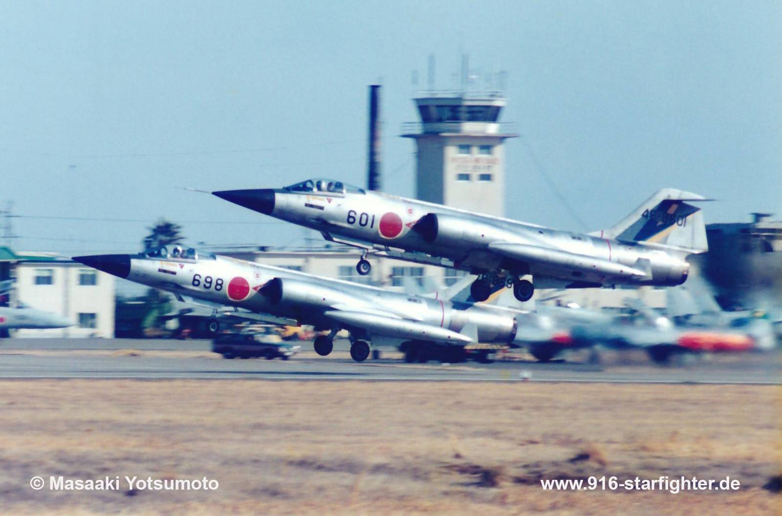 F-104J "698" 204 Hikotai formation take-off at Nyutabaru AB February 7, 1984 during ACM exercise F-104J, construction number 683B-3198, model 683-07-14, JASDF serial number 76-8698, built by MitsubishiMitsubishi built; delivery date July 21, 1967; 203 Hikotai 1969 2nd Kokudan at Chitose AB; 1975 temporarily with 207th Hikotai at Naha AB after some months to 204th Hikotai at Nyuutabaru AB, seen May 11, 1978, until Hikotai re-arranged in 1984; later ended with 207th Hikotai; withdrawn from use January 8, 1986 display Hamamatsu AB, Public relations hall "Air Park" JASDF; first noted as UF-104 already September 24, 1999, C-2 seat, J-79 engine, as faked target drone UF-104JA, Scorpion Hikotai marks 2006 noted; in perfect condition May 1, 2009 noted; October 2013 noted with "Scorpion" markings, C-2 seat, J79 engine, perfect condition, May 1, 2009 noted; October 2024 noted.