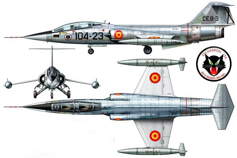 TF-104G "104-02" (serial number 62-12279) 104 Escuadrón 1967 TF-104G, construction number 583C-5524, model 583-10-20, US serial number 62-12279, Spanish serial number CE.8-2, built by Lockheedmanufactured by Lockheed; assembly at Lockheed, Palmdale; Lockheed test flights at Palmdale, CA; USAF delivery date on November 4, 1964 to Brookley AFB, Mobile, Alabama assigned MAP on January 3, 1965; Spanish serial number CE.8-2; MAP to Spain on January 15, 1965 by ship to Rota NAS coded TG-279/22279 to 61 Escuadrón at Torrejon AB on March 4, 1965 with 14 flight hours; to renamed 161 Escuadrón of 16 ALA at Torrejon AB coded 161-02 in 1965 1967 coded 104-02 with renamed 104 Escuadrón; coded 104-22 with 104 Escuadrón in 1968; Spanish serial number changed to CE.8-22 IRAN at FUS (Germany) on September 29, 1969 with 593 flight hours, back to 104 Escuadrón on April 29, 1970; transferred to 122 Escuadrón on May 31, 1971 withdrawn from use May 31, 1972; back to USAF May 31, 1972
