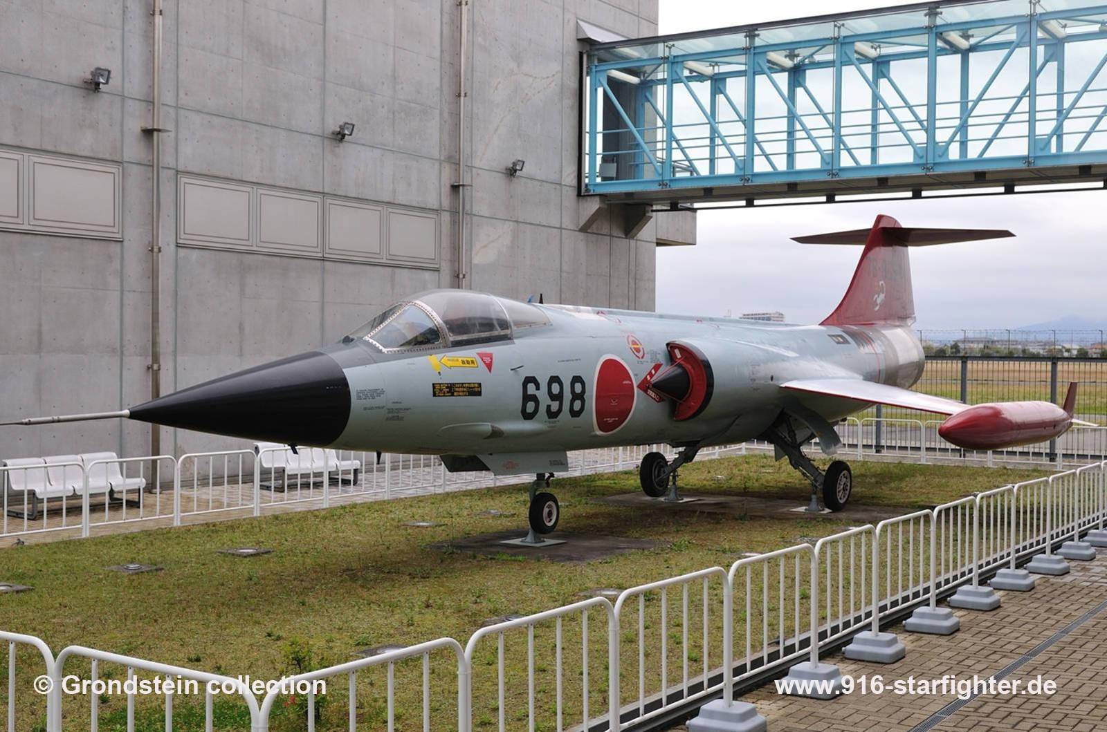 F-104J "698" displayed as UF-104JA at the Hamamatsu museum 2020 F-104J, construction number 683B-3198, model 683-07-14, JASDF serial number 76-8698, built by Mitsubishifirst 2nd Kokudan at Chitose; 1975 temporarily 207th Hikotai at Naha AB; after some months to 204th Hikotai at Nyutabaru AB, until Hikotai re-arranged in 1984 ended later with 207th Hikotai; 1982 withdrawn from use display Hamamatsu AB, JASDF museum Public relations hall "Air Park" JASDF; first noted as UF-104J already September 24, 1999, C-2 seat, J79 engine as faked target drone UF-104JA, Scorpion Hikotai marks, 2006 noted; perfect condition, May 1, 2009 noted with "Scorpion" markings, first noted September 24, 1999, C-2 seat, J79 engine, perfect condition, October 2024 noted.