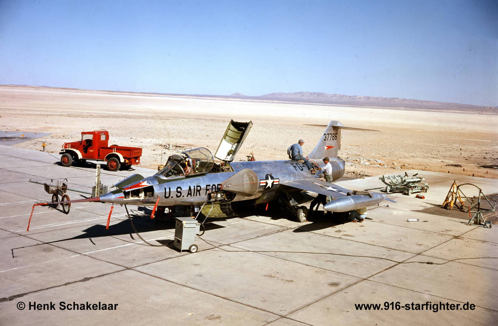 XF-104 FG-786 (37786) during pre-flight preperations in 1956 XF-104, construction number 083-1001, serial number 53-7786, built by Lockheed The second prototype 53-7787 was fitted with the afterburning J65 from the start. Since it was to be the armament test bed, it was fitted with the 20-mm Vulcan cannon and was equipped with an AN/ASG-14T-1 fire control system. Initial aerial firing tests with the Vulcan cannon were successful, but on December 17, 1954 there was an explosion during a firing burst (supersonic at 43,000 feet) and the J65 engine started to run rough. Test pilot Tony LeVier immediately shut down his engine and glided back to make a successful dead-stick landing at Rogers Dry Lake. An investigation later showed that one of the 20 mm cannon rounds had exploded in the breech, blowing the bolt out the rear of the gun and into the forward fuselage fuel cell. Jet fuel gushed into the gun bay, and leaked out of the gun bay door joints and into the left engine air intake. The engine immediately flooded with fuel, choking it to death. Tony LeVier was lucky to be alive. Tony LeVier note: This was the most difficult and stressful forced landing of my flying career, gliding for 50 miles! copyright © Henk Schakelaar