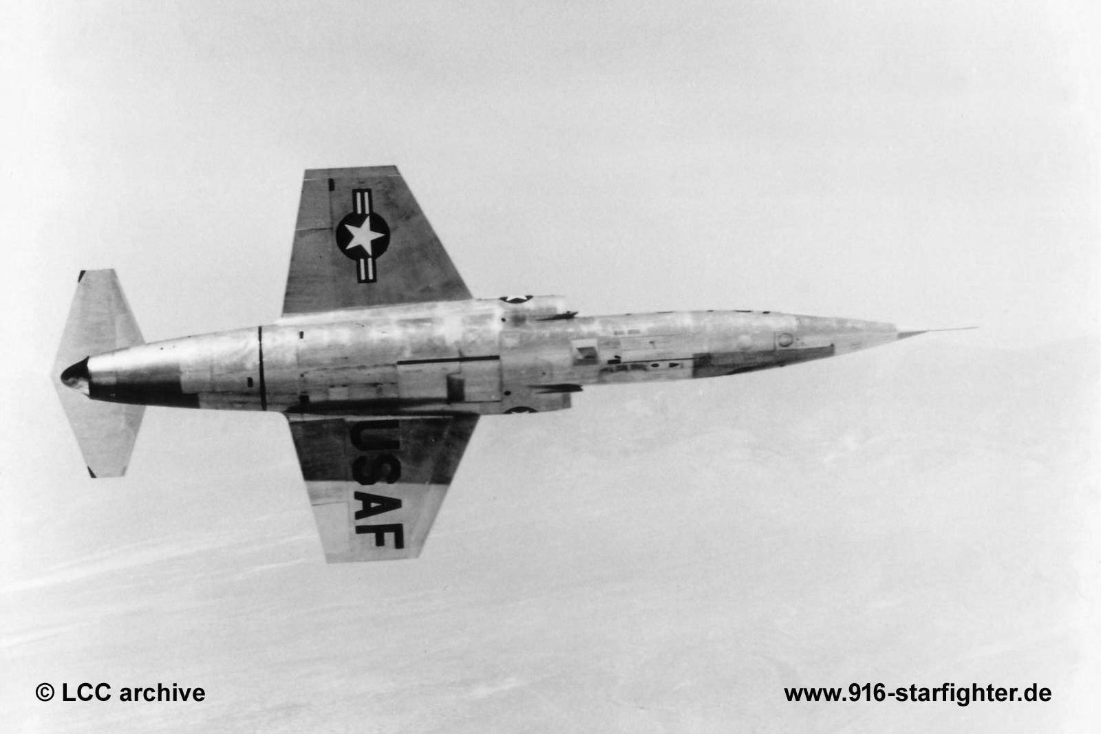 XF-104 37786 belly up with the early engine inlet duct XF-104, construction number 083-1001, serial number 53-7786, built by Lockheed aerodynamic test bed, February 28, 1954 unplanned taxi lift-off with Anthony W. "Tony" LeVier; first flight March 4, 1954 crashed on July 11, 1957 near Mojave, California due to uncontrollable tail flutter resulting from a unsecured fuselage fuel tank cap coming off and striking the vertical stabilizer. Testpilot Bill Park ejected safely. copyright © Lockheed archive