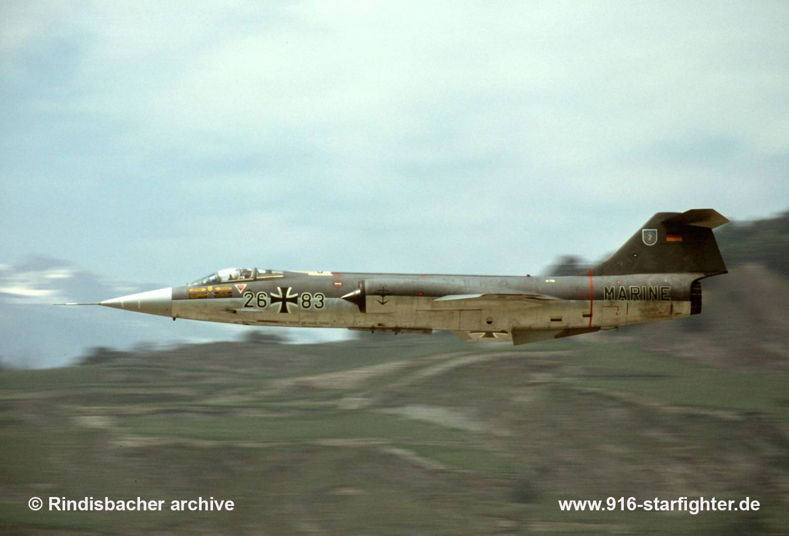 "Vikings" 26+83 at Sion AB, Switzerland for the “Sion Air show” June 13, 1986 F-104G, construction number 683D-7429, company model 683-10-19, built by MBB manufactured by South Group (ARGE-Süd) & VFW; assembled by MBB-Manching starting March 29, 1972 as attrition replacement aircraft assembly in Fighterbomber version according contract lot 9; first flight June 7, 1972 at MBB modification level "Neptun" as Fighterbomber (for German Navy) with "AS.30" and AS.34 "Kormoran" anti-ship missile delivery system Navy camouflage scheme "Norm 76" according tech order "TA-196-3"; acceptance date July 11, 1972 by GPS-MBB 26+83 MFG 1 at Schleswig-Jagel AB delivery date on July 9, 1972; MFG 2 at Eggebek AB on September 24, 1980; Luftwaffenschleuse 11 added an AN/ALE-40(N) Chaff/Flare countermeasure dispenser equipment according tech order "TA-1469" on February 13, 1984, back to MFG 2 on April 5, 1984; TechnGrp 11 of LVR 1 "F-104 Kommando" at Erding AB on October 31, 1986 withdrawn from use and stored at LwSchleuse 11 on May 5, 1987; preservation according tech order "TA 1485"; struck off charge order (AVA) on February 10, 1989MAP (Military Assistance Program) to Hellenic Air Force on April 20, 1989 with 2.181 flight hours for spare part use (ferry with Greek C-130), but used by the 116.Pterix at Araxos AB coded "FG-7429" in 1990 withdrawn from use May 28, 1992 and last flight from 116 Combat Wing to 132 Combat Group at Agrinion AB (HAF Detachment); stored October 2017 noted. copyright © Rindisbacher archive