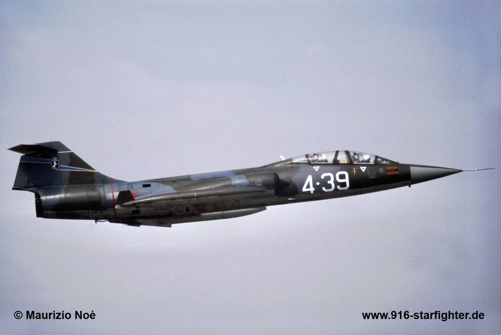 TF-104G "4-39" 20°Gruppo in the late camouflage scheme and large codes TF-104G, construction number 583H-5208, model 583-10-20, serial number MM54257, reassembled by FIATmanufactured by Lockheed at Palmdale, California, airlifted to Turin, reassembled and delivered to AMI delivery date AMI 16.10.1969; delivery date 20°Gruppo 22.1.1970, 20-22 2.12.1972-22.4.1985; IRAN + R3 repair 26.2.1973-12.8.1977 IRAN 2.2.1981-31.3.1982; 4-39 17.7.1985-04.1997; IRAN 25.8.1986-23.11.1987; IRAN 13.11.1991-24.3.1994 severely damaged during a touch and go after a precautionary landing pattern without nose gear at Grosseto on April 23, 1997 (DBR) both crewmembers (Cap. Locatelli, Daniele and Ten.Col. Abriani, Alessandro) were safe during the landing at Grosseto this aircraft could not extend its nose gear, it landed on its main gear and damaged it front-belly severely withdrawn from use and dumped 13.3.1998; dump Grazzanise 10.10.2005; May 2007 noted, scrapped. copyright © Maurizio Noe