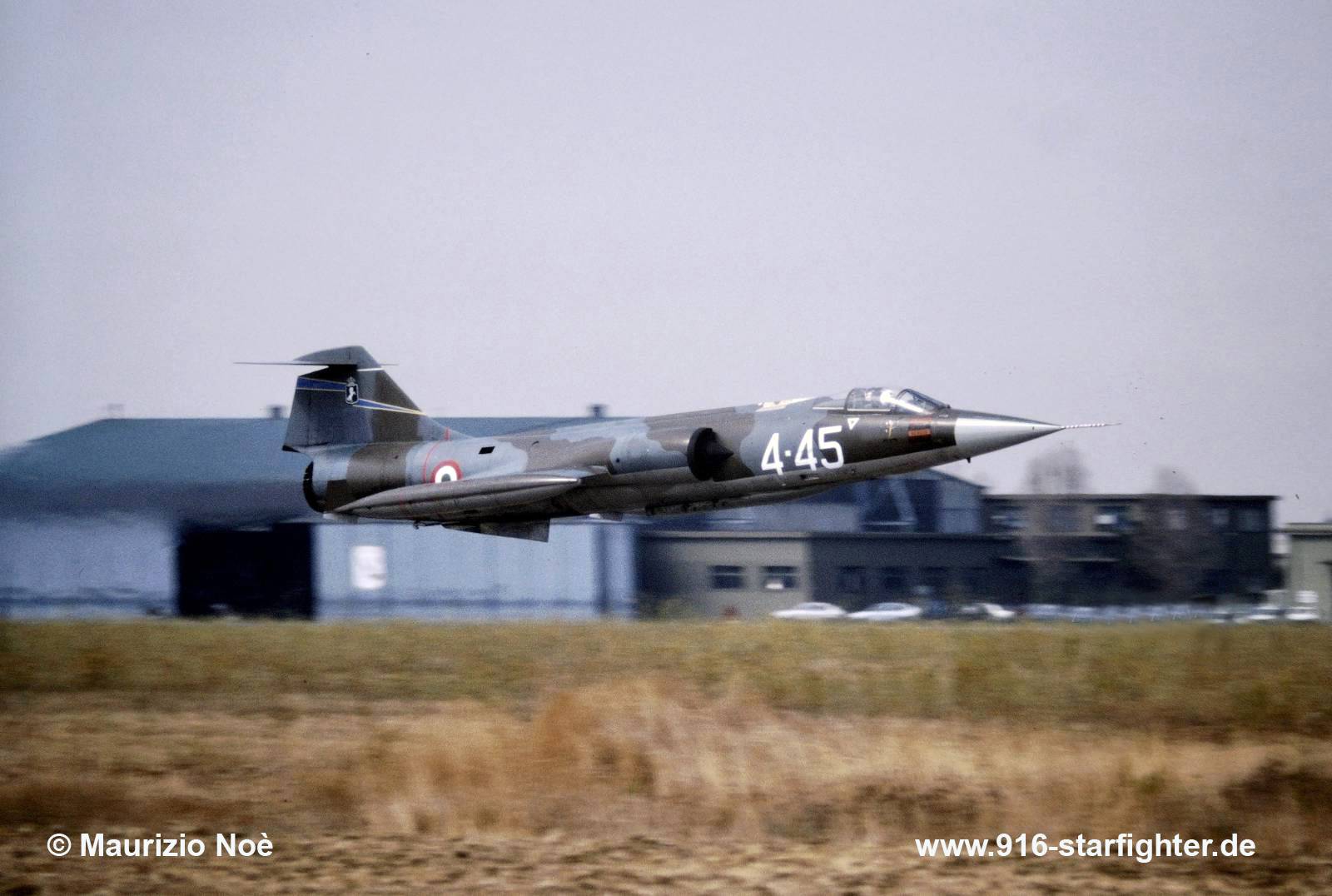 F-104G "4-45" (MM6558) 20°Gruppo of 4°Stormo at Grosseto AB September 1985 F-104G, construction number 683D-6558, serial number MM6558, model 683-10-19, built by FIATdelivery date AMI 7.2.1964; 4-40 September 1966 10 Gruppo (part of 4 Aerobrigata) from Grazzanise, Italy exchanged with the German Air Force JG74 (1st Staffel) at Neuburg; 9-14 7.12.1966-14.10.1969; IRAN 14.10.1969-11.5.1970; delivery date 10°Gruppo 11.5.1970, 9-?? 05.1970-25.6.1973 IRAN from 25.6.1973; 3-38 132°Gruppo of 3°Stormo 22.7.1974; 6-23 19.4.1977; IRAN 29.6.1978 delivery date 154°Gruppo of 6°Stormo 29.6.1978, 6-24 19.4.1979-30.7.1981 October 1980 154 Gruppo from Ghedi exchanged with RAF 3 Squadron based at Gutersloh flying the Harrier GR3 aircraft; IRAN 30.7.1981-4.11.1982 delivery date 20°Gruppo 4.11.1982, uncoded 19.11.1982; 20-34 31.3.1983-07.1984; new code 4-45 17.7.1985-7.1.1987; IRAN 7.1.1987-13.6.1988 delivery date 132°Gruppo 13.6.1988, 3-02 26.8.1988-6.1.1991; August 1989 German Navy MFG 1 (2nd Staffel), based at Schleswig Jagel, flying the Tornado IDS, exchanged with the Italian Air Force 132°Gruppo based at Villafranca, flying the F-104G; 3-53 25.6.1991-30.9.1991 Iraq war AMI "Ace Guard" operations at Erhac AB, Turkey in 1991; last flight 17.12.1991, withdrawn from use Villafranca 2.1.1992 with 3.367.flight hours dump 04.1994-07.2003 (destroyed CFE 07.1994); Verona-Villafranca dump tail/fuselage separated 2003 last noted; scrapped. copyright © Maurizio Noe