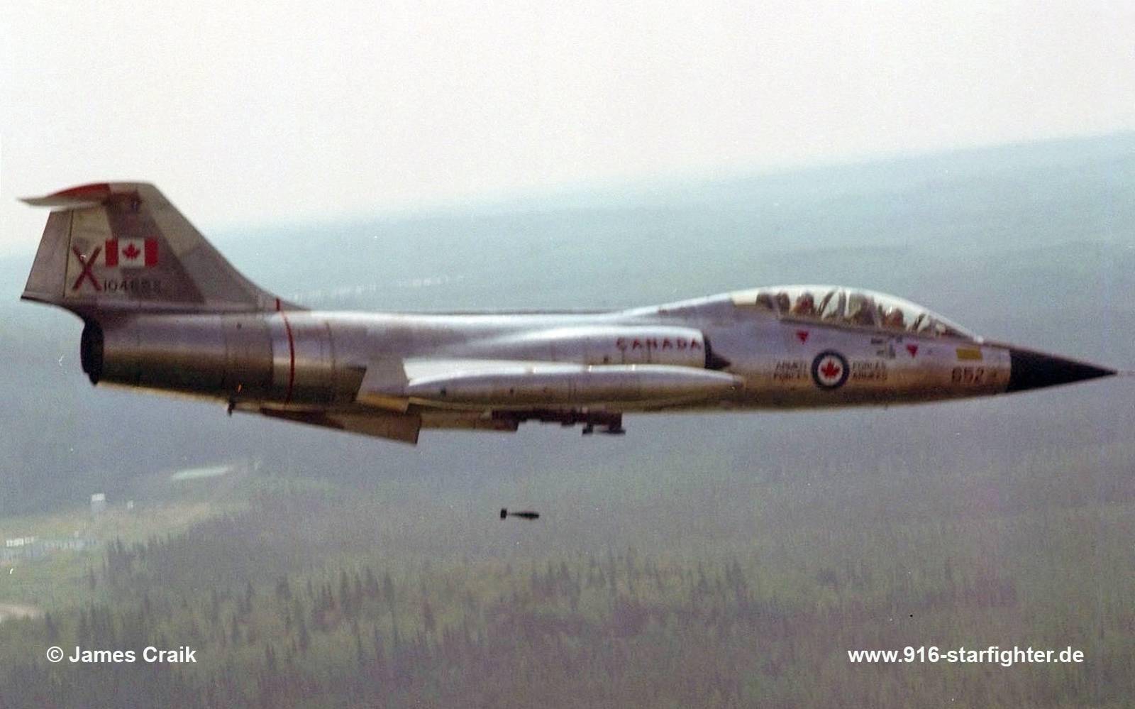 CF-104D "652" of Aerospace Engineering Test Establishment (AETE) from CFB Cold Lake during bomb (BDU-33 bomblet) delivery release 1981 CF-104D, Lockheed model 583-04-15, Lockheed construction number 583A-5322, RCAF serial number 12652, Mk.1 (Dual Training Aircraft), built by Lockheedlast Mk.1 (Dual Training Aircraft), originally carrying the tail number 12652; February 3, 1962 construction start at Lockheed; September 3, 1963 taken on strength delivered to Cold Lake August 20, 1964; reserialed July 28, 1970 652 served with the Aerospace Engineering Test Establishment and its predecessors, Central Experimental Proving Establishment (CEPE/AETE) and 448 (Test) Squadron from 1963 to 1984 This aircraft flew with the Aerospace Engineering Test Establishment during its entire service life until retired in 1984. Fewer than 2.000 flying hours were accumulated on the airframe AMDU (Aerospace Maintenance Development Unit) at Trenton 1984 as repair instructional airframe "823C" donated to the Canadian Command & Staff College, North York, Ontario August 9, 1993; completed restoration on July 20, 2006; April 2010 noted; March 2024 noted.