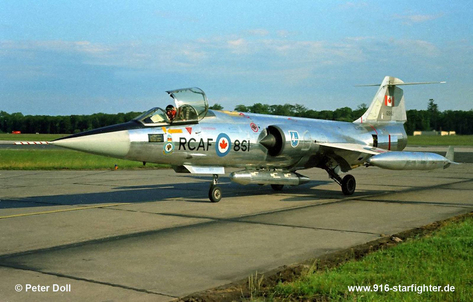 CF-104 "861" in June 1968 during TWM 68 at Jever AB, with 4 ATAF team badge on intake CF-104, Canadair model CL-90, Lockheed model 683-04-12, Canadair construction number 683A-1161, RCAF serial number 12861, built by Canadairfirst flight November 27, 1962, taken on service by RCAF as CF-104 12861 on November 13, 1963 first unit 1 Air Division in Europe; as 12861 of 3 Wing in June 1968 at TWM 68 at Jever AB, 4 ATAF team badge reserialed as 104861 effective June 1970 crashed with 1 CAG, flown by 439 (ST/R) squadron on October 24, 1970 hitting ground shortly after take-off, pilot did not eject; struck of service November 5, 1970. 3 (F) Wing RCAF Zweibrucken crest copyright © Peter Doll