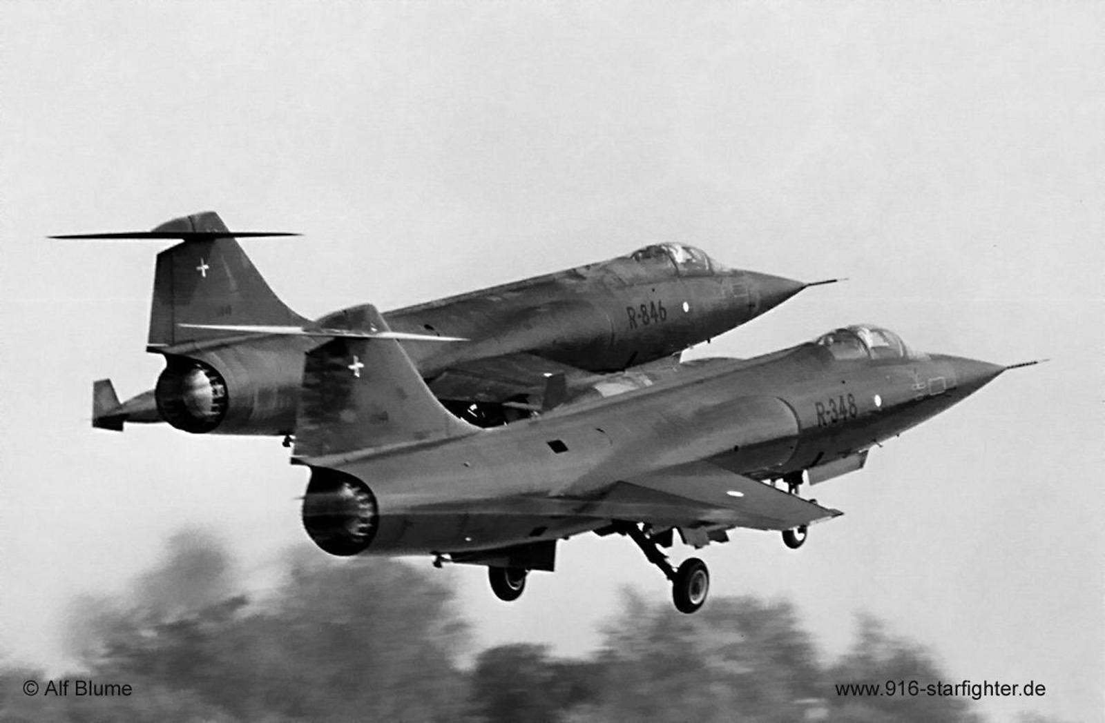 F-104G "R-348" RDAF during wing take-off at Aalborg AB in October 1977 F-104G, construction number 683C-6047, model 683-10-19, US serial number 62-12348, built by Canadairfirst flight May 1, 1964 at Canadair; ready at Canadair July 9, 1964; delivery date USAF on August 6, 1964 coded "FG-348/22348" to MOAMA Brookley, Alabama shipped to Denmark; the aircraft arrived at Nørresundby, Denmark on deck of the aircraft carrier USN ship "Fiddler" on November 23, 1964 MAP to Denmark coded R-348 on November 23, 1964; Esk 726 delivery date January 6, 1965; Esk 723 on September 22, 1965 repainted in an all green camouflage scheme on November 6, 1969; repainted in glossy green camouflage scheme on July 15, 1977 January 8, 1983 to Esk 726; last flight April 11, 1986; withdrawn from use April 30, 1986 with 4.094 flight hours preserved and disassembled at Aalborg and transported by road to Aarhus for shipment to Bremerhaven on April 1, 1987