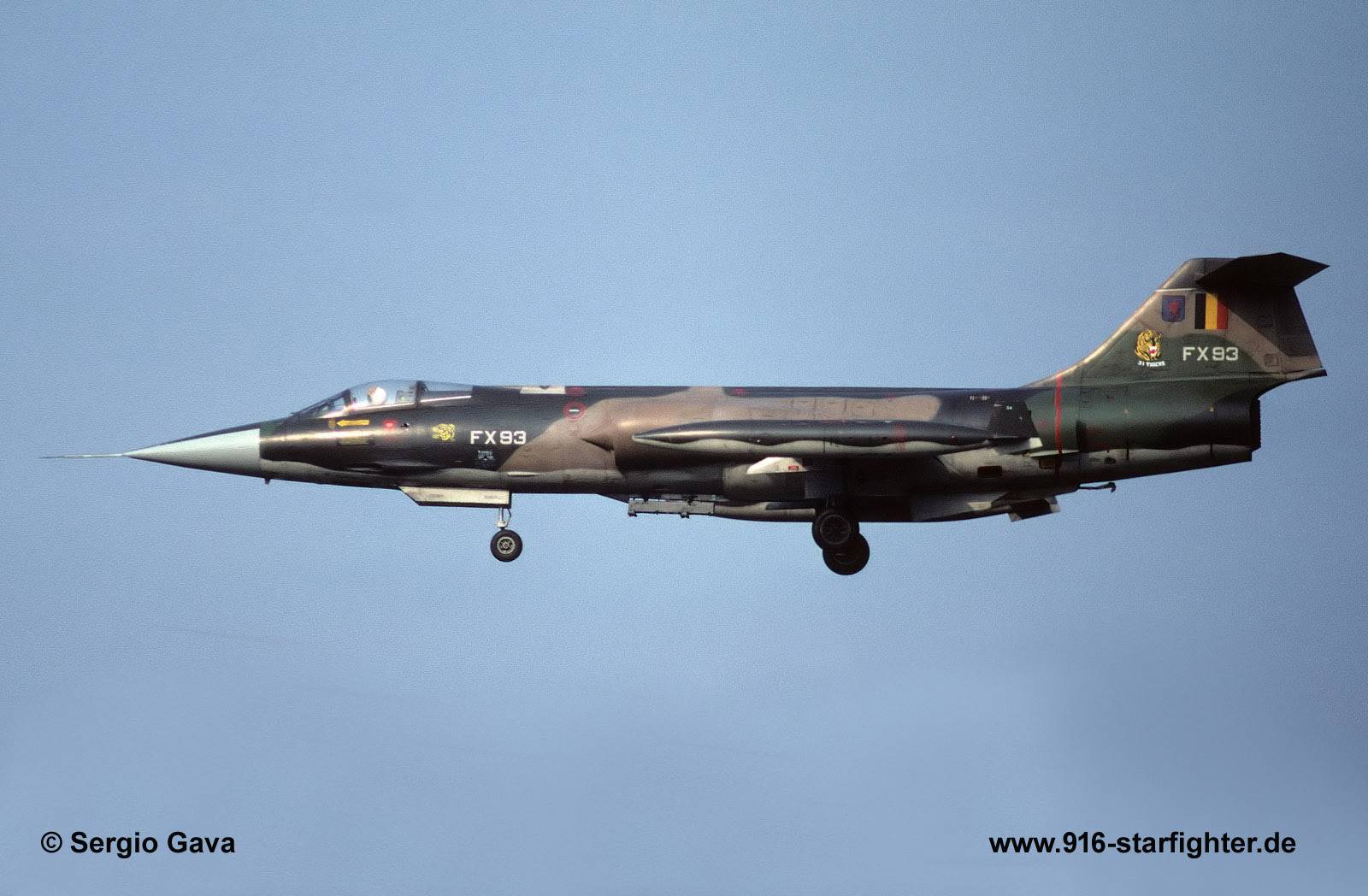 F-104G "FX93" Belgian Air Force 31 squadron during Tiger Meet at Cameri AB, Italy in 1980 F-104G, construction number 683D-9160, model 683-10-19, built by SABCAFX93 taken on service March 23, 1965, 1 Wing until 1978, 10 Wing until 1982, storage Koksijde April 6, 1982 sold to Radcomm Enterprise and struck of charge in January 1987 stripped of all useful parts; November 15, 1989 at Aux Les Milles, Aix-en-Provence, France in Escadrille Pegase collection; 1995 at Lafayette War Museum, Orange, France Zru Air Park, Pilsen (Czech Republic) July 2, 2000, August 23, 2008 noted; August 2022 noted (weathered).