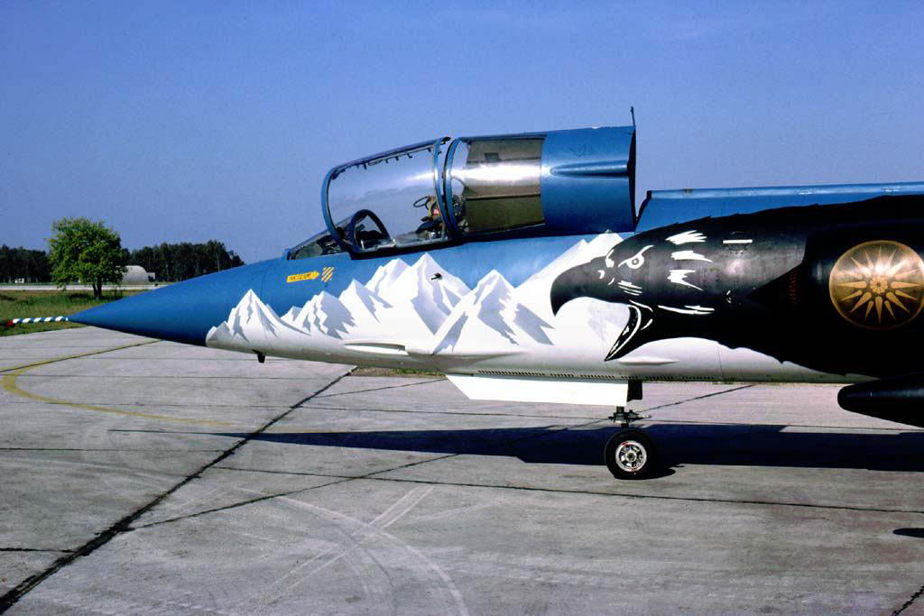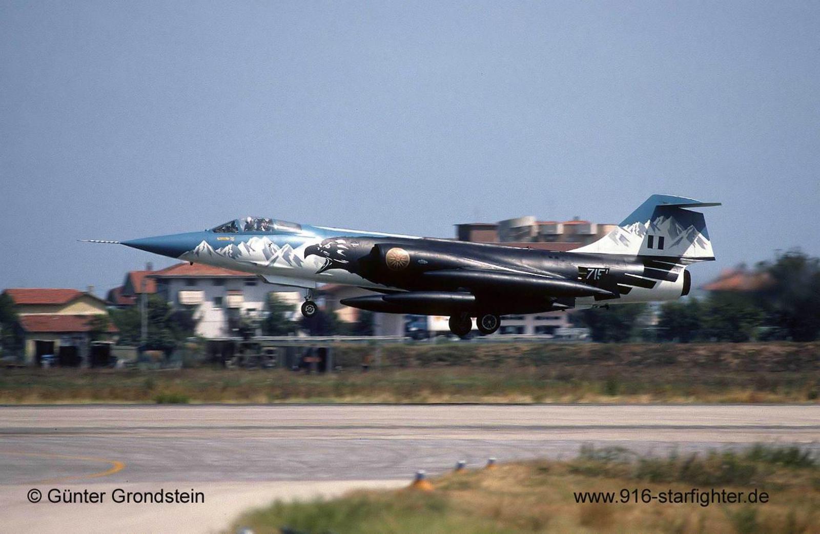 F-104G 7151 "Olympus" 116th Pterix 336th "Olympus" Mira at Rimini AB 1992, ex Luftwaffe F-104G, construction number 683D-7151, model 683-10-19, built by Messerschmitt manufactured by South Group (ARGE-Süd); assembly start at Messerschmitt-Manching February 5, 1964; assembly in Fighterbomber version according contract lot 5; first flight April 17, 1964 coded KE+451 modification level "Yoga" as Fighterbomber (for MFG 1) with AS.30 "Kormoran" anti-ship missile delivery system, Sidewinder missile launch rails and long range tanks camouflage scheme "Norm 62" according tech order "TA-196"; acceptance date by BABwMTT August 20, 1964; ErpSt 61 at Manching AB delivery date on August 24, 1964VA+127 MFG 1 at Schleswig-Jagel AB on October 11, 1965; 22+70 damaged September 25, 1968 while hitting a cable in the Vaerrasund, Norway and emergency landing at Oerland AB flown with C-74 Globemaster of USAF to Messerschmitt; repaired at Manching and back to MFG 1 Navy camouflage scheme "Norm 76" according tech order "TA-196-3" in 1971; IRAN at SABCA on July26, 1971 with 925 flight hours, back to MFG 1 on October 10, 1971 withdrawn from use at LwSchleuse 11 on August 31, 1981 with 2.355 flight hours; struck off charge order (AVA) October 16, 1981