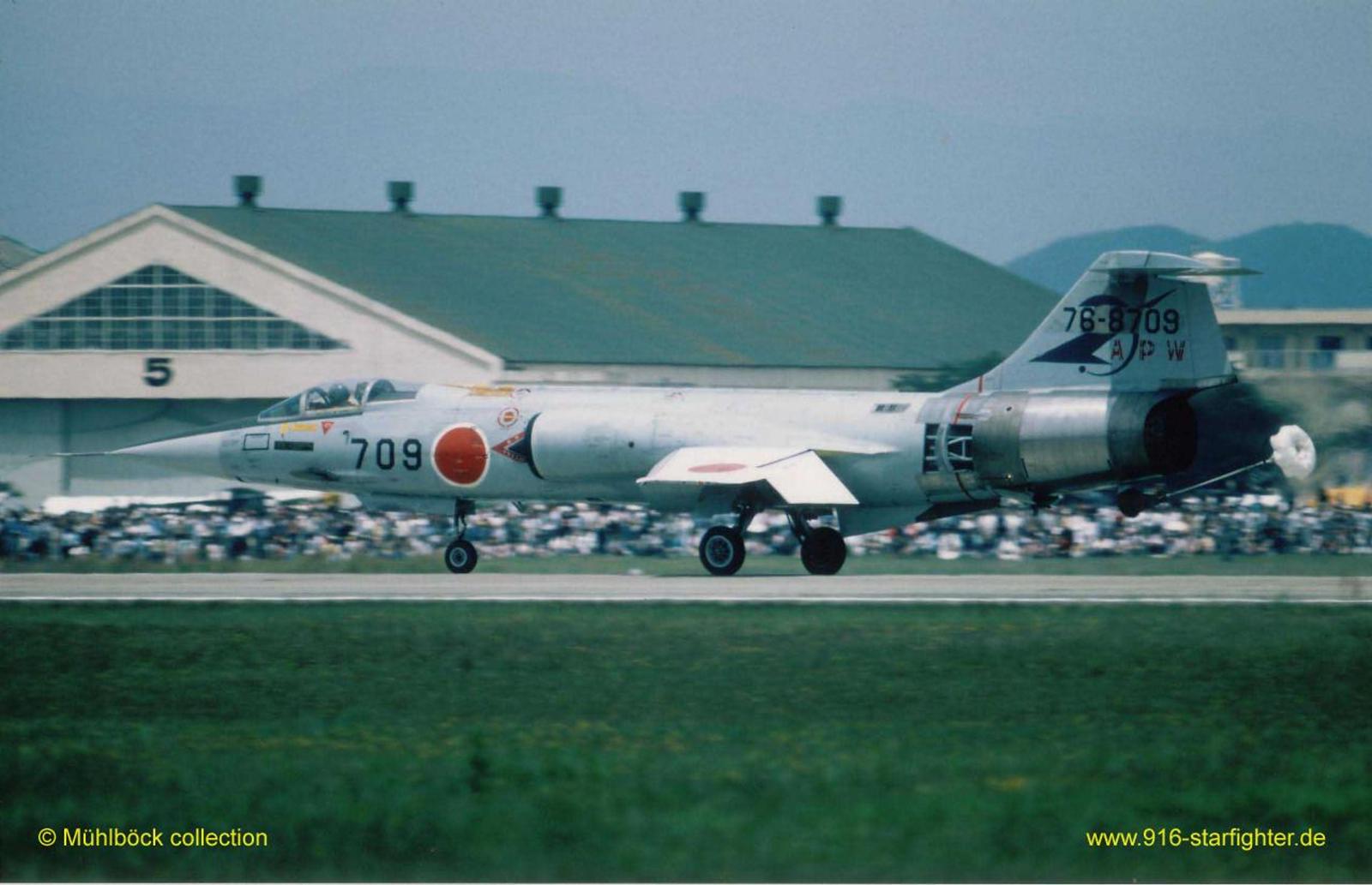 F-104J "709", serial number 76-8709, of APW (Air Proving Wing (Test Wing)) JASDF at Gifu AB F-104J, construction number 683B-3209, model 683-07-14, JASDF serial number 76-8709, built by Mitsubishidelivery date November 15, 1967; 1989 207 squadron Gifu AB; 207 squadron 1991; APW (Air Proving Wing (Test Wing)) Gifu AFB UF-104JA target drone as 76-3709 shot down at firing range located near Iwo Jima Island on February 21, 1996. Mitsubishi UF-104J The last duties for JASDF F-104J were to be unmanned target drones. Two F-104Js were modified to UF-104J experimental drones and tested by ADTW. The two UF-104J (renamed from QF-104J (XQF-104J)) were drones with a cockpit, and 12 became UF-104JA drones without a cockpit. On December 18, 1989 was the first flight of XQF-104J drone nr.1 46-8592. After that, a total of 14 Starfighters converted to UF-104JA target drone and all of them were shot down at firing range located near Iwo-Jima island, famous battlefield of WW2. Between March 1992 and January 1997, all these completed their missions against "hostile" F-15J at Iwo Jima. copyright @ Mühlböck collection