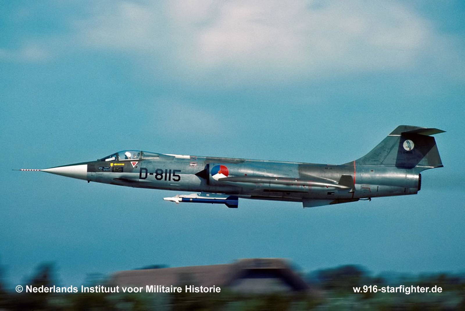 F-104G "D-8115" 322 squadron Leeuwarden AB, Netherlands in Air Defense configuration in a high speed pass at Vliegbasis Leeuwarden 1980 F-104G, construction number 683D-8115, model 683-10-19, built by Fokkermanufactured in AWX version by North Group; assembly by Fokker-Schiphol; delivery date January 28, 1964; 323 squadron January 1964-1969; 322/323 squadron pool 1970-August 1980