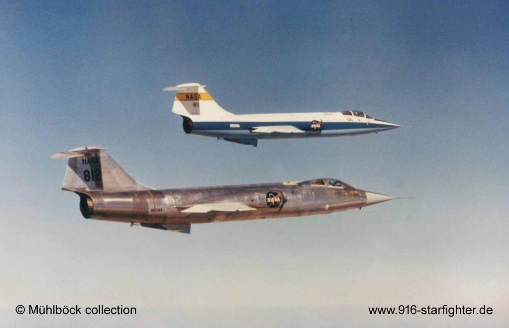 F-104N "NASA 812" in formation with NASA 811 F-104N, construction number 683C-4053, model 683-10-19, a F-104G model, built by Lockheed, registered N812NANASA 812 [N812NA] F-104N was officially delivered to the NASA in July 1963 but was added to the official NASA list on September 30th, 1963 and eventually flown over to the NASA facility (by Joe Walker) on October 1, 1963 for high speed chase flights coded NASA 012; from the beginning it flew with code "012" and very bright NASA color scheme. In 1970 it was resprayed into the well known white-dark blue-light blue scheme which later on changed into white-blue-white. It got also recoded into N812NA; the last big project for N812NA as chase plane was the X-29 development program which was in 1985. Its operational career ended on December 29, 1986 when NASA pilot Einar Enevoldson made the last flight and wrote the last of 4442 flights in total in the aircraft logbook The NASA stored the N812NA at Edwards and used it also for spare parts to keep the other 104s in the air After the last Starfighter operations within the NASA ended also this N812NA was dropped from the inventory and was prepared to become a display aircraft; first at USAF Flight Test Museum at Edwards AFB till at least 1997, then it moved to Lockheed-Martin in Palmdale as Gate Guard where they converted the aircraft into an XF-104 replica by removing some vital parts including inlet-cones and top fairing; iIt was put on display in 2002 near Plant 42 "Skunk Works" in bare metal with no markings, with intake cones removed; September 2005 preserved repainted as NASA 812 at Palmdale carrying the old NASA colors with code "012". They did not change it back to standard F-104G/N but the inlet cones were just painted instead, August 2, 2009 noted Gate Guard at Lockheed Martin Aeronautics Co, Palmdale, CA May 2021 noted; August 2023 noted.