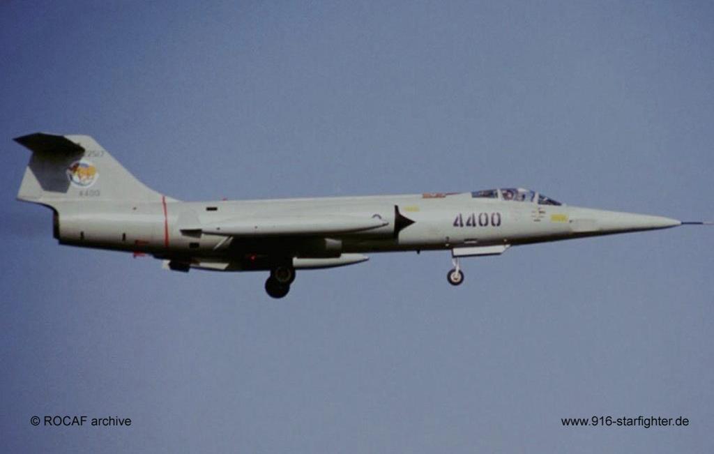 RF-104G "4400" (67-22517) in grey camouflage 12th Special Mission Squadron of 5 Wing ROCAF, Tao Yuan AB RF-104G, construction number 683D-8230, model 683-04-10, serial number 67-22517, built by Fokkermanufactured by North Group (ARGE-Nord); first flight March 16, 1964 coded KG+330 at Fokker-Schiphol RF-104G photoreconnaissance version modification at Weserflug in March 1964 with project "Recce" camouflage scheme "Norm 62" according tech order "TA-196"; acceptance date July 15, 1964 by BABwFokker (RNAF-MTA) LVR 3 (Luftwaffenversorgungsregiment 3) at Manching AB on July 23, 1964 for modifications AG 52 at Leck AB delivery date on September 18, 1964; planned code EB+106 was not used KG+330 according project "Columbus III" airlifted to USA on November 16, 1965 initially planned for SLAR test [RF-104G-1], but not used; modified to F-104G at Lockheed-Palmdale