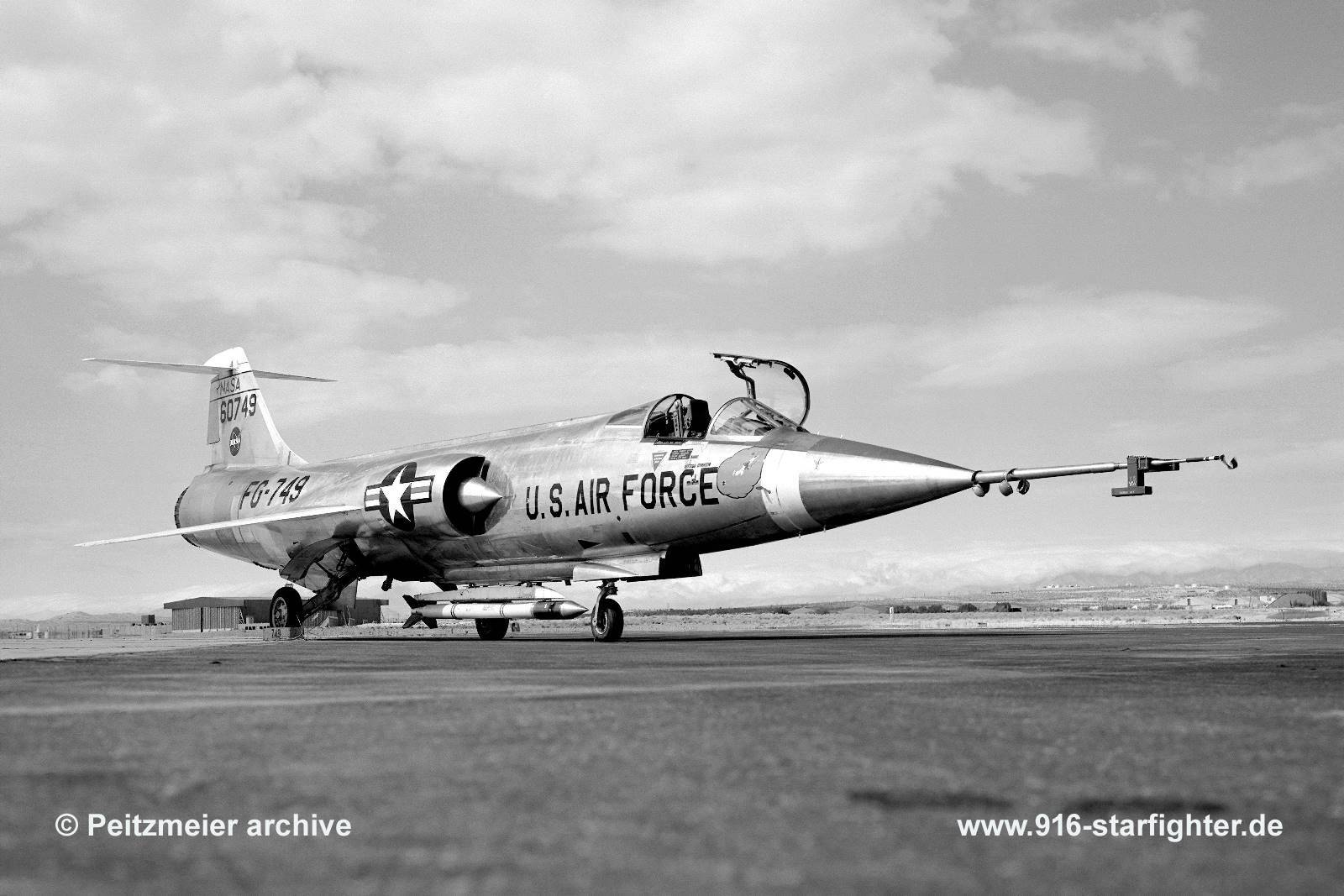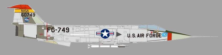 JF-104A "FG-749" NASA with special noseart during high altitude rocket launch tests 1961 F-104A, construction number 183-1037, model 183-93-02, US serial number 56-0749, built by Lockheeddelivery date May 27, 1957; Air Research and Development Command (ARDC) 1957-April 1959 arrived at NASA Flight Research Center (FRC) HSFS on April 13, 1959 flown by Neil Armstrong; modified with special instrumentation and redesigned JF-104A modified for high-altitude centerline rocket (balloon) launch tests with ventral-mounted Air Launched Sounding Rocket (ALSOR) The intent of the program was to release a balloon from an air launched rocket at over 1.000.000 feet altitude (approximately 190 miles) and then measure its rate of descent to determine the air density. served as a launch platform for parachute test vehicles and experimental sounding rockets later, it was used for mission support, pilot proficiency and as a chase plane for other research aircraft; in all, seven NASA pilots flew the airplane 249 times NASA pilot Milton Thompson ejected safely at Edwards AFB when the plane suffered asymmetric flap condition during X-15 gliding exercises which resulted in an uncommanded roll, aircraft was destroyed in the crash on December 20, 1962 at Edwards AFB, on the Rogers Dry Lake. http://www.nasa.gov/centers/dryden/history/Features/Thompsons_Wild_Ride.html copyright © Peitzmeier via NASA archive see nose close-up below