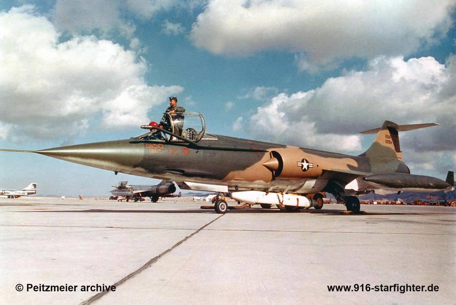 F-104C "60914" (56-0914) in the new SEA camouflage scheme at George AFB in 1966 F-104C, construction number 183-1202, model 483-04-05, US serial number 56-0914, built by Lockheeddelivery date to the USAF January 8, 1959; 479th Tactical Fighter Wing (Tactical Air Command), George AFB, CA April 1966 to 476 Tactical Fighter Squadron; August 1966 to 435 Tactical Fighter Squadron (Pacific Air Forces), Udorn, RTAFB March 1967 to 8th Tactical Fighter Wing (PACAF), Udorn, RTAFB; August 1967 to 198th TFS of 156 Tactical Fighter Group PR ANG (Air National Guard), Ramey AFB, PR served with the USAF in West Germany, Spain, Taiwan, Vietnam, Laos, and Thailand It was flown to the Museum at Wright-Patterson AFB on August 18, 1975 by Julio A. Fuentes on display at National Museum of the U.S. Air Force at Wright-Patterson Air Force Base in Dayton, Ohio (WPAFB); March 2024 noted.