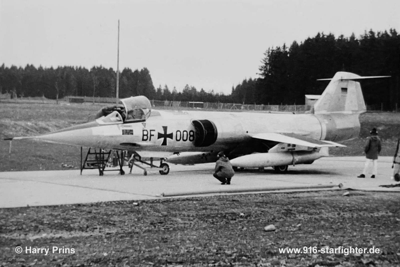 F-104G BF+008 at Kaufbeuren AB with Technische Schule der Luftwaffe 1 (TSLw 1) 1961 F-104G, construction number 683-2007, company model 683-10-19, built by Lockheed manufactured by Group USA (ARGE-USA); assembly in Fighterbomber version according contract lot 1 first flight 1961 at Lockheed-Palmdale; flight tests flown with register number "107"; with "Joint Test Force" at Palmdale AP for "Category I" basic system tests airlifted with C-124 airfreighter to the Technische Schule der Luftwaffe 1 (TSLw 1) at Kaufbeuren AB on August 18, 1961 with 19:15 flight hours accepted on August 18, 1961 by BABwMTT in Silver-finish colors; project "Balance" (upgrading) was not implemented BF+008 at Technische Schule der Luftwaffe 1 (TSLw 1) as instructional airframe (GIA) the same day; LPR 1 on July 16, 1963; TSLw 1 on February 19, 1964 20+07 instructional airframe (GIA) at Kaufbeuren AB until October 16, 1985; struck off charge order (AVA) October 16, 1985 withdrawn from use and BDRT (Battle Damage Repair Training) airframe (fire department) at Fassberg AB on July 14, 1987; stored Fassberg AB 1998 with training aid code "C056" for sale by VEBEG in 2000; preserved Museum für Luftfahrt und Technik Wernigerode in 2001; ready for sale in July 2008 noted December 2014 on loan to Mr. Wichert for a private collection in Freiberg, Saxony; trucked to Freiberg July 7, 2015; March 2022 noted; at Oederan, district Wingendorf April 2024 noted. claim of fame: aircraft never flew in Germany! It just flew 19 hours in the USA! copyright © Harry Prins